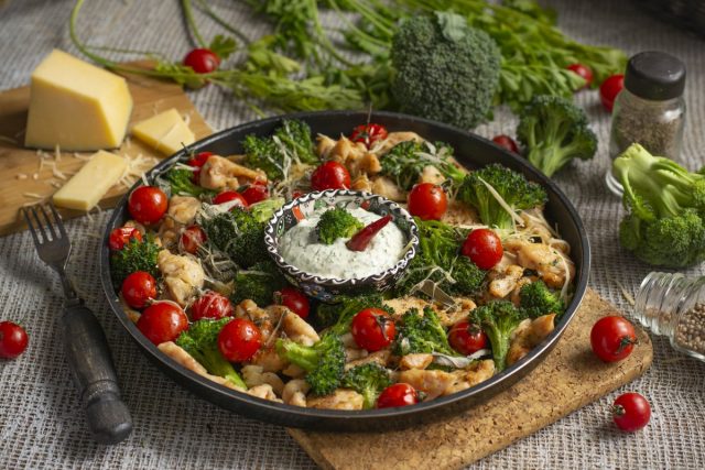 Достаём блюдо из духовки и немедленно подаём на стол с йогуртовым соусом, в который так вкусно обмакнуть кусочки куриного филе и нежную брокколи. Низкокалорийная курица с брокколи и черри в духовке готова. Приятного аппетита.