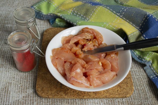 Для этого рецепта курицы с брокколи и черри нам понадобится филе куриной грудки, нарезаем её узкими тонкими ломтиками поперёк волокон. Кладём нарезанное мясо в миску, солим, перчим, посыпаем сладкой паприкой, добавляем чайную ложку оливкового масла, перемешиваем. Оставляем мясо мариноваться на 10 минут.