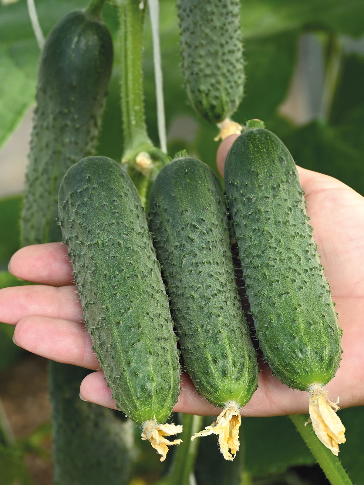 Высокую стабильную урожайность демонстрирует Форсаж F1. Этот гибрид (для открытого грунта и теплиц) отличается ранним плодоношением (38-42 дня) и дружной отдачей урожая. В каждом узле формируется по 2-5 выровненных тёмно-зелёных огурчика с плотной, хрустящей мякотью. Плоды крупнобугорчатые, цилиндрические, длиной 10-12 см, без горечи. Устойчив к болезням, транспортабелен и универсален в кулинарии.