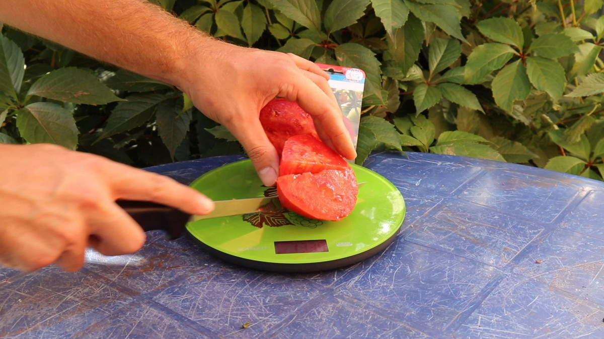 Отличительные черты сорта – громадные плоды малинового цвета. Вес одного такого гиганта может достигать 1 кг и даже немного больше. Кроме удивительной крупноплодности, сорт удивил и высокой завязываемостью. Многоплодных кистей на одном растении образуется несколько. Вес полной кисти впечатляет – 1 кг 677 г. Что касается вкусовых качеств, то томаты сочные, хотя и немного водянистые. Мякоть сладкая, с легкой кислинкой.