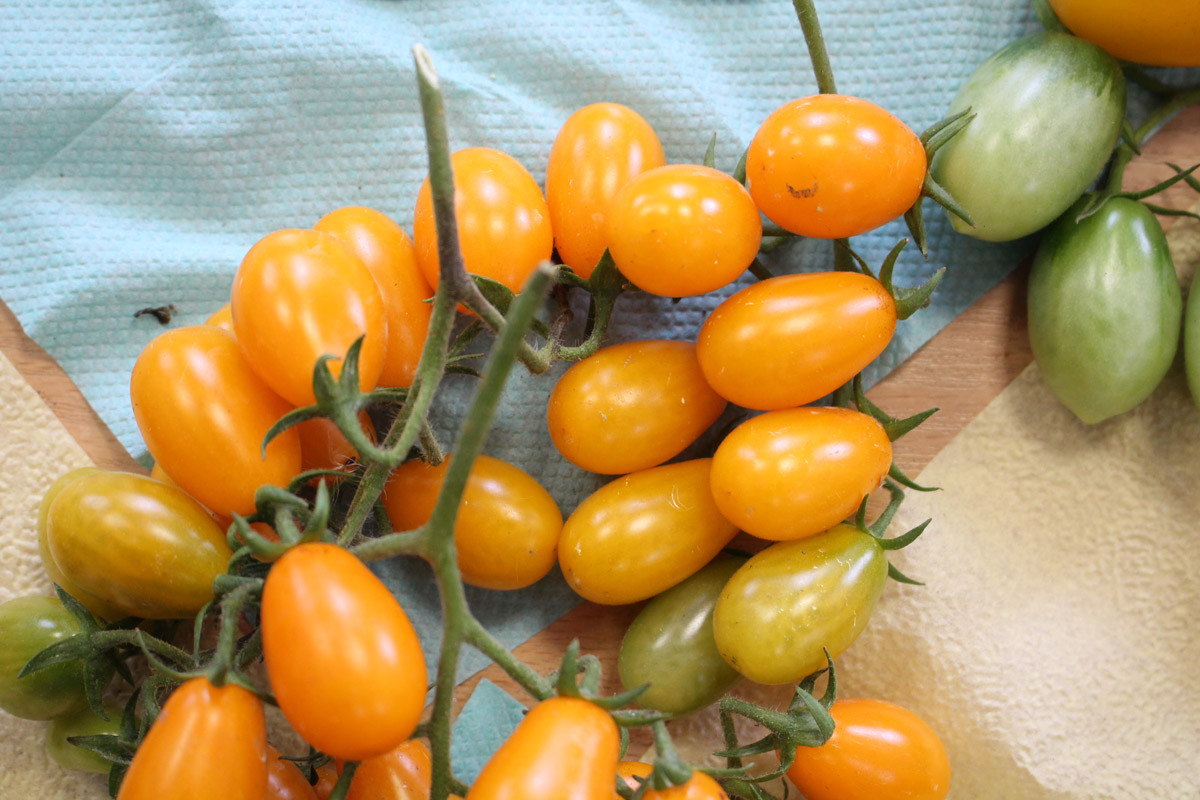 Среди черриков выделился сорт «Грушевый апельсин». Маленькие грушки жизнерадостного апельсинового цвета. Индетерминант, невероятно урожайный на пасынки. Впрочем, этим многие сорта черри отличаются. Хорош цветом, вкусом, плотной мякотью, тонкой кожицей. Из-за засухи плоды выросли мелкие, с крупную виноградину, зато прямо-таки конфетно-сладкие. В вяленом виде вообще, как сухофрукты.