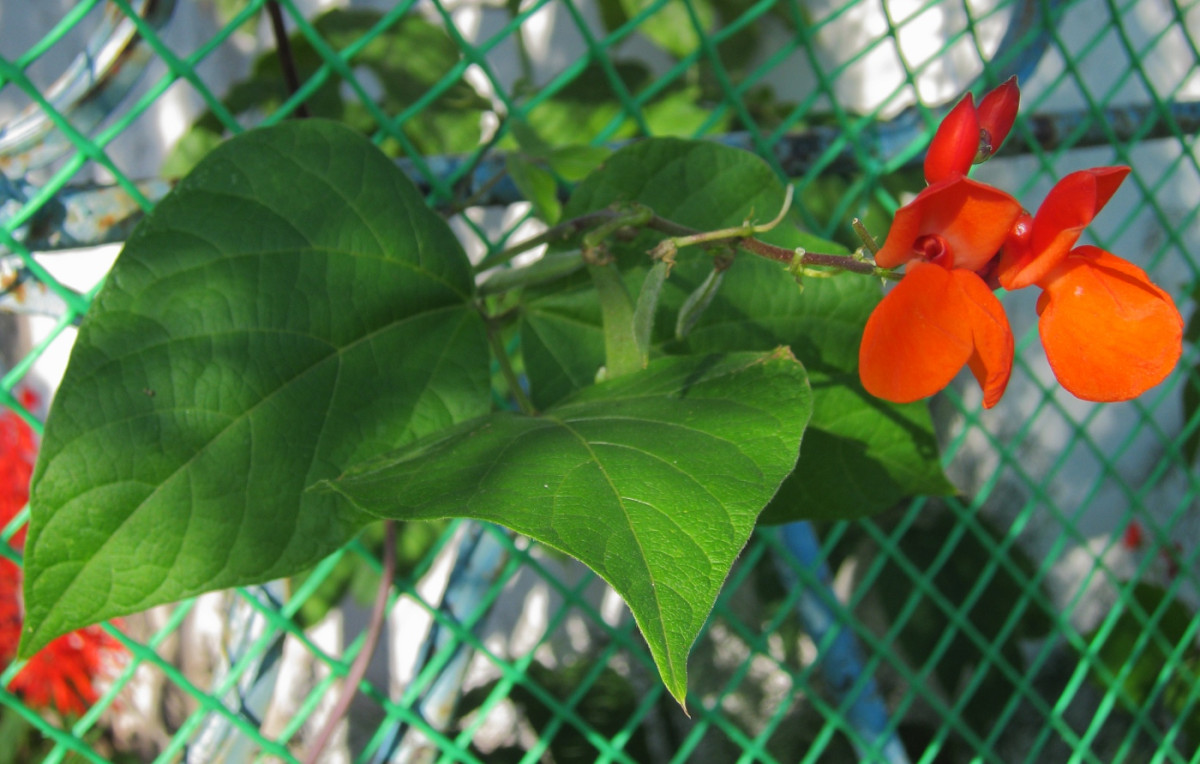 Фасоль огненно-красная «Энорма» — вариант 2 в 1. Здоровущая лиана, у нас выросла выше 2,5 м. Тёмно-зелёные, типично фасолевые листья красиво оттеняют яркие кораллово-красные цветки. Замечательное декоративное растение. После цветения завязываются бобы. В нашем случае до 30 см длиной и чуть больше 2 см шириной. Семян там немного, штук 6-7, но они крупные. При хорошем влагообеспечении бобы были бы крупнее, у нас и бобы вигны в этом сезоне больше 40 см не вырастали (обычно 60-70 см). Вкусная фасоль.