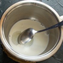 Делаем пропитку. Насыпаем в сотейник сахар, наливаем сливки. Нагреваем на тихом огне, пока сахар не растает.