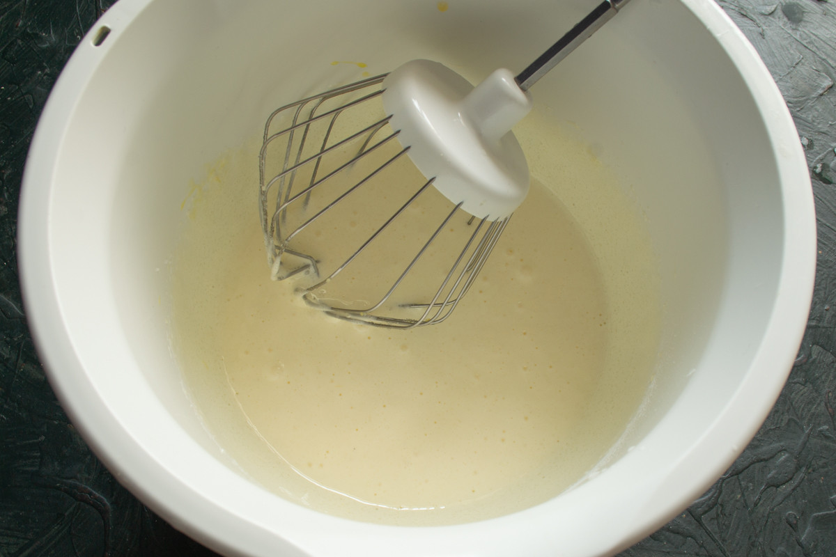 В чашу миксера разбиваем куриные яйца. Насыпаем сахарный песок, для баланса вкусов добавляем щепотку мелкой соли. Взбиваем яйца с сахаром несколько минут, пока смесь не превратится в светлую, пышную массу без крупинок сахарного песка.