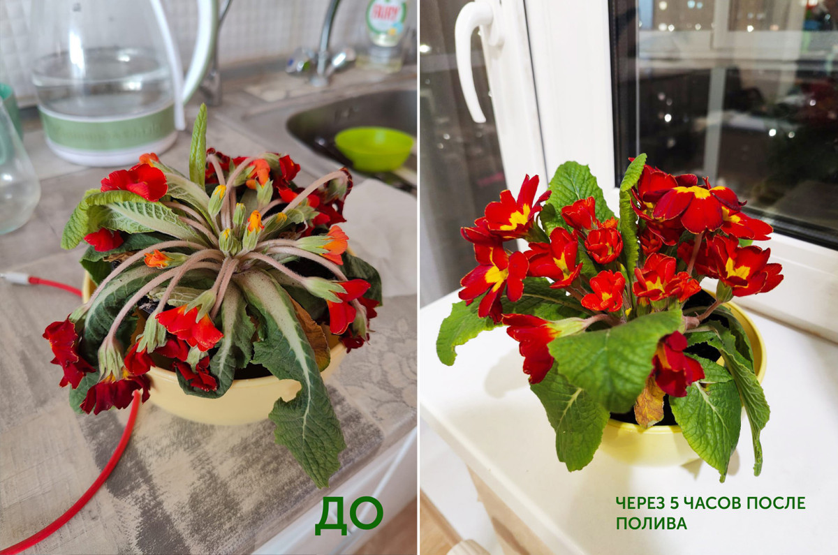 Примула не выдержала резких перепадов температур и стресса от транспортировки. По прибытии домой ее подкормили раствором удобрения Гринлайф. И уже через 5 часов примула ожила. Это объясняется антистрессантами в составе удобрения.