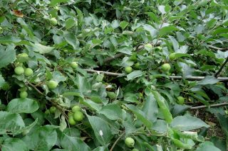 Недостатки у способа тоже есть: такое деревце занимает большую площадь. Наши яблоньки «накрывали» по 4-6 м2. Во время плодоношения под ветки приходится что-то подкладывать, иначе яблоки лежат на земле. Удаление сорняков под кроной — не самое простое мероприятие. Зато яблоки свои и много.