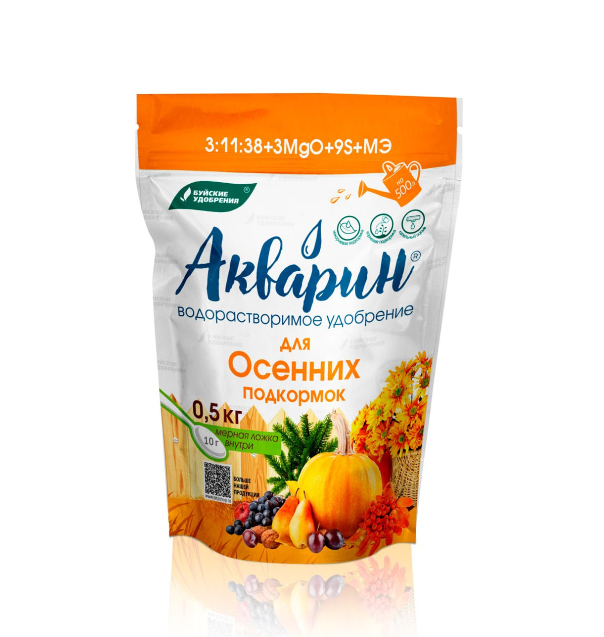 Нередко многолетникам необходимо дать быстрое питание для нормального окончания сезона и созревания урожая. И здесь мало конкурентов у водорастворимого удобрения «Акварин» для осенних подкормок. Идеальный баланс макроэлементов для завершения сезона – NPK 3:11:38, наличие в составе магния, серы, железа, цинка, меди, марганца, молибдена, бора позволяет закрыть потребности любых культур.