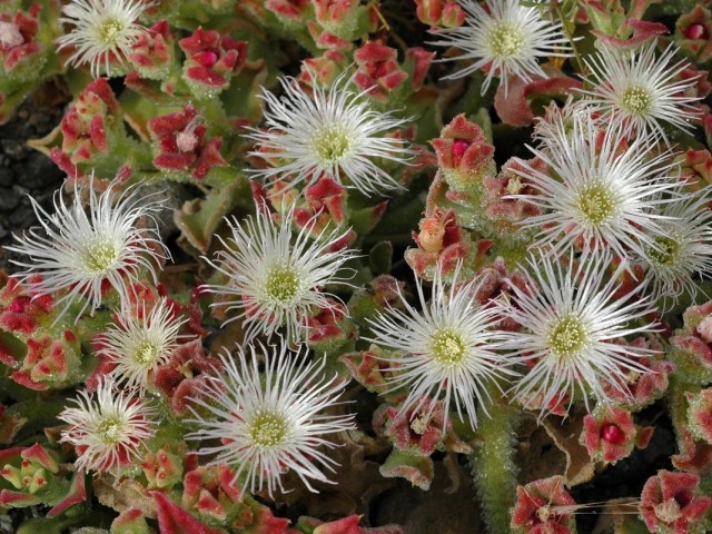 Мезембриантемум хрустальный или хрустальная трава (Mesembryanthemum crystallinum) – самый популярный из видов. Это сильно ветвящийся полукустарник с крепкими, но довольно тонкими побегами, наполовину одревесневающими у самого основания в довольно значительном возрасте. Толстые, сочные и мясистые, яйцевидные листья этого мезимбриантемума поражают насыщенным ярко-зеленым окрасом и очень красивой ложной опушкой из густо расположенных желез. Корзинки соцветий мезимбриантемума хрустального в диаметре ограничиваются максимальными 3-мя см. Внешне их сложно не спутать с махровыми ромашками или астрами, тем более, что базовый окрас у них тоже белый с желтым центром. Но у этого вида есть немало декоративных сортов, предлагающих полюбоваться на разноцветные взрывы окрасок восхитительно ярких корзинок.