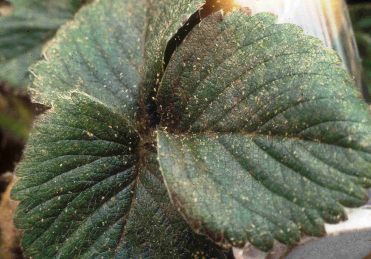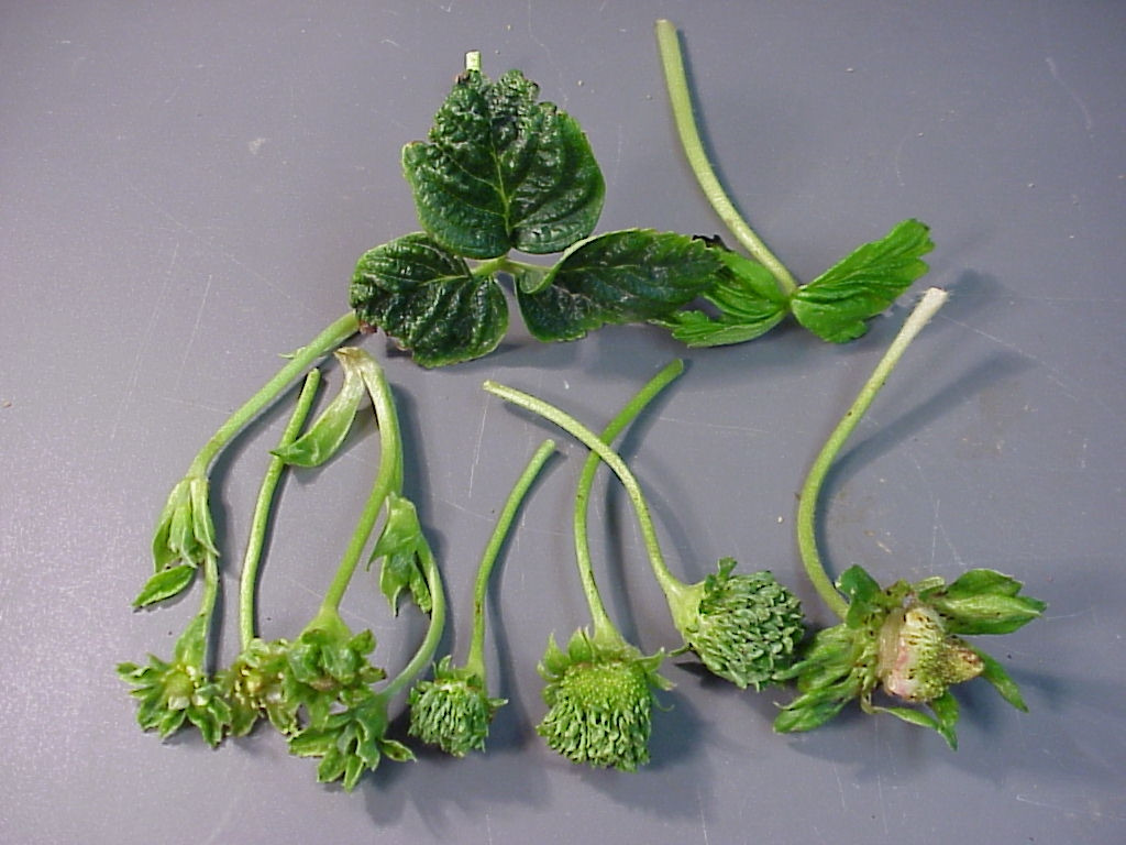 Земляничные клещи обитают исключительно на землянике. Они очень маленькие (0,25 мм) и прячутся в скрученных листьях в центре куста. Если посмотреть через увеличительное стекло, клещи выглядят как мелкие капельки воды, однако они подвижны. При питании клеща точка роста растения станет тусклой и голубовато-зеленой, центр растения при этом будет коричневым. Пораженные растения дадут короткие, коренастые цветоносы, которые не будут развиваться.
