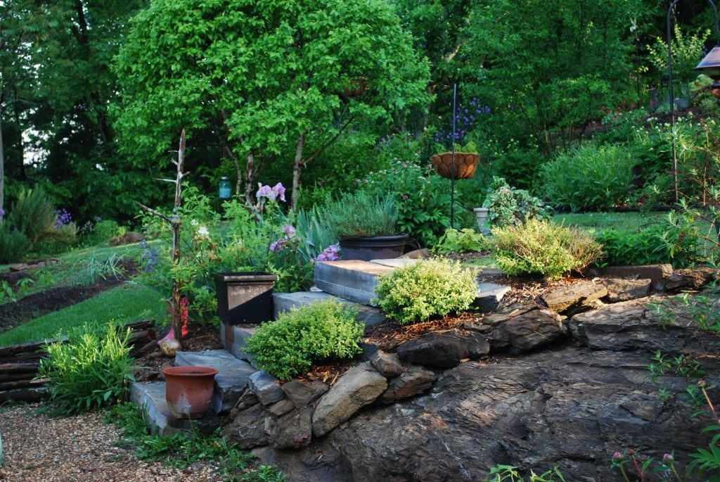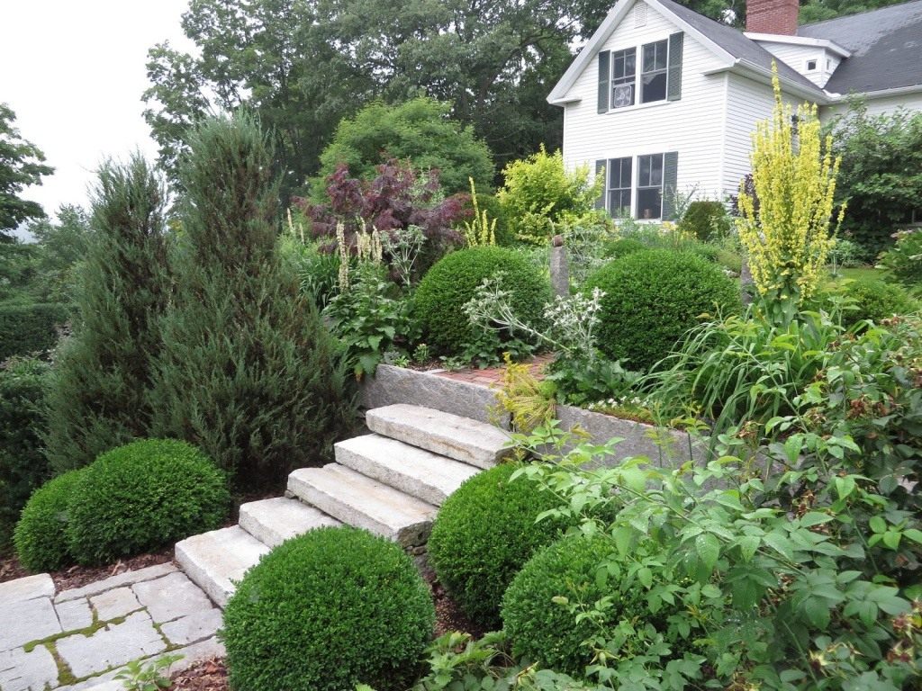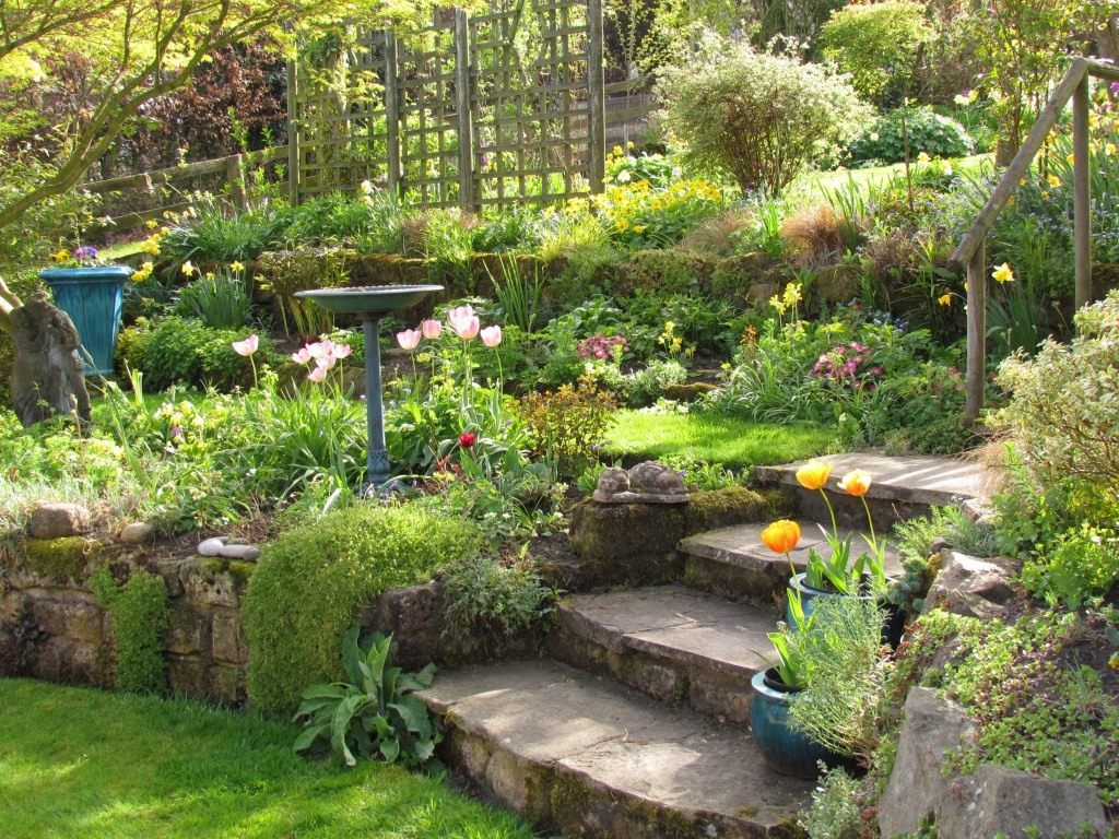 - при помощи растений вписать многоуровневую тропку или лестницу в сад, частично замаскировать и скрыть её доминантность;