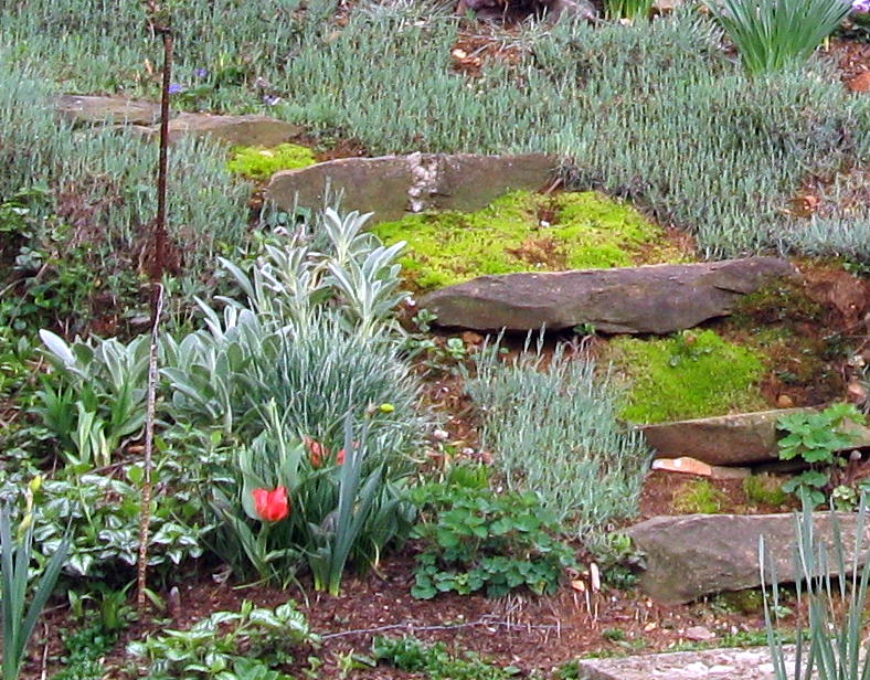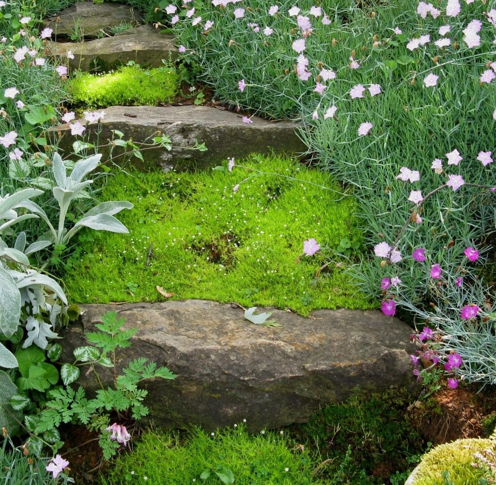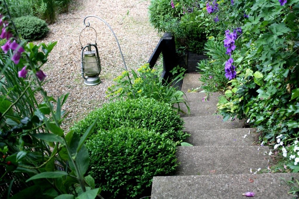 Растения-партнеры, с помощью которых можно создать основной пышный контур вокруг дорожек с лестницами должны отвечать только двум критериям — не требовать практически никакого ухода и обладать способностью создавать объемные заросли и перекрывать почву. Долговечные, неустанные и привлекательные в течении всего года садовые герани, манжетка мягкая, хосты, почвопокровные розы, тимьяны, плющи, наперстянки и астильбы, лилейники, колокольчики, ясколки, почвопокровные флоксы, папоротники, шалфеи и котовники, вероника, яснотка пятнистая, клопогон, люпины, бересклет Форчуна, стелющиеся можжевельники – выбор потрясающе велик.