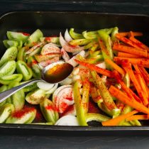 Посыпаем овощи молотой сладкой паприкой, перемешиваем и отправляем противень в нагретый до 190 градусов по Цельсию духовой шкаф.
