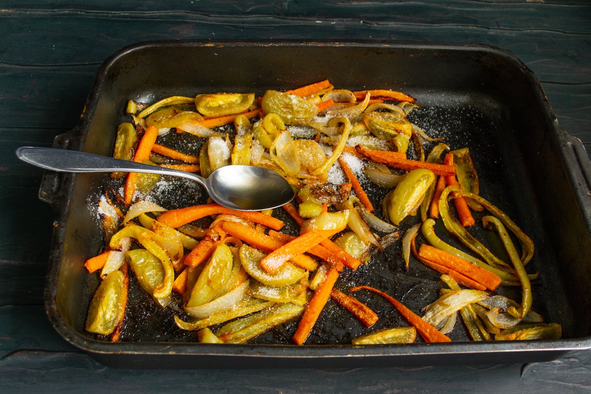 Готовим 35-45 минут, несколько раз перемешиваем. Если овощи немного поджарятся, то это просто замечательно, они будут вкуснее.