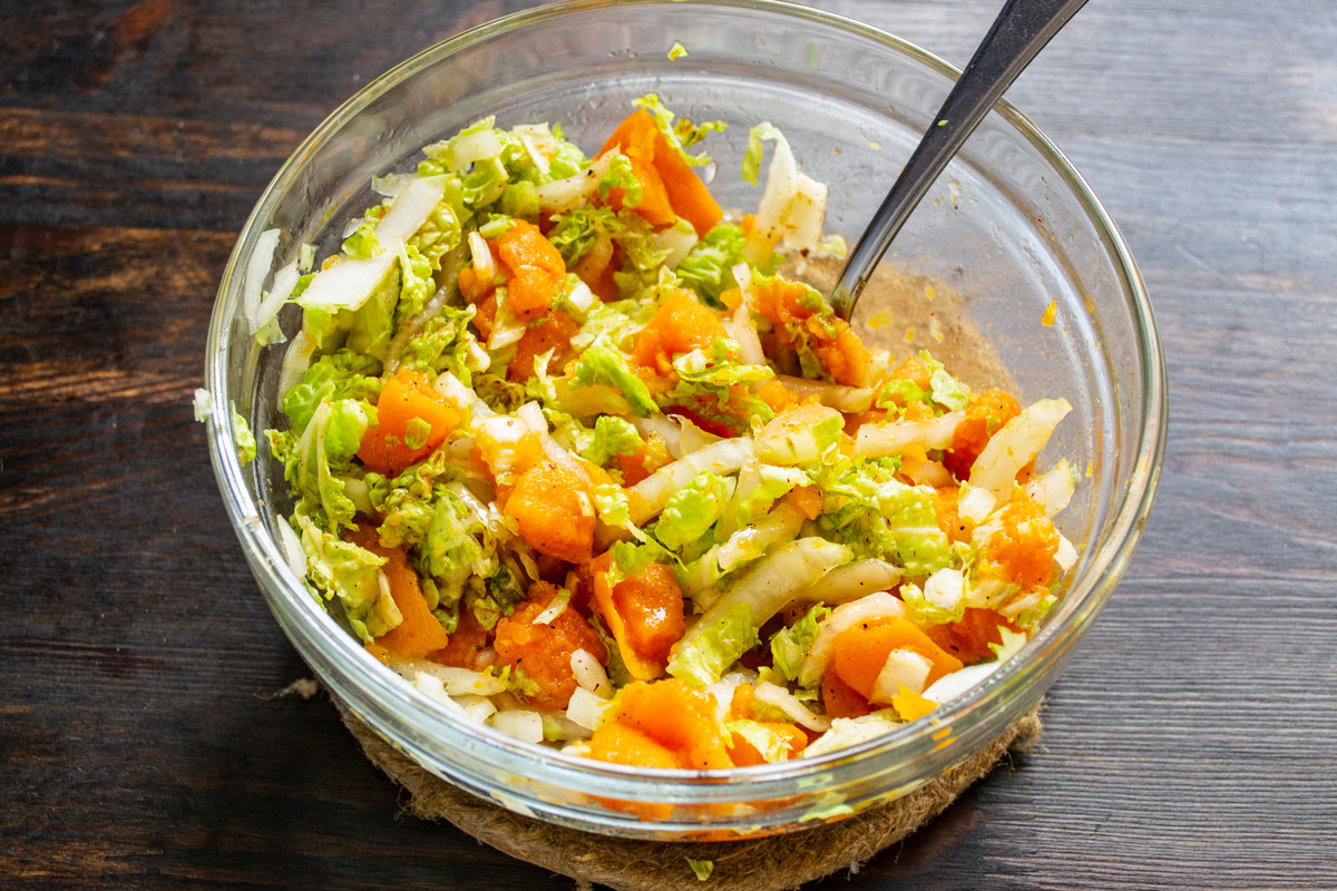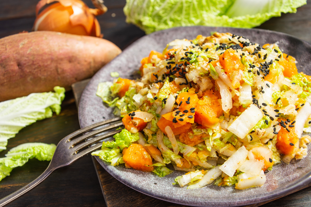 Легко и полезно – готовим овощной салат со сладким картофелем, пекинской капустой и низкокалорийной, пикантной заправкой. Такой салат можно приготовить на ужин, это легкое овощное блюдо для вегетарианского меню и в пост.