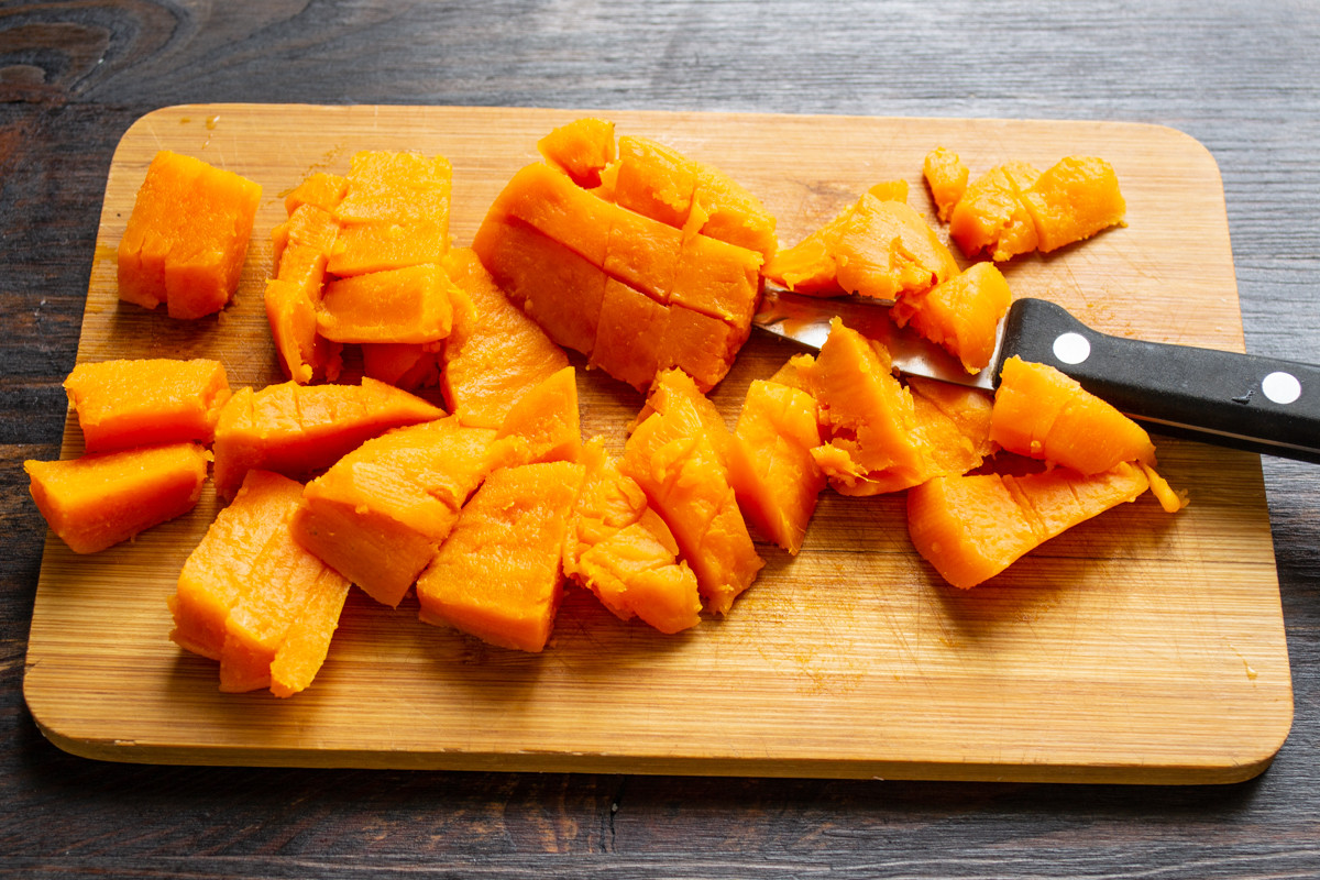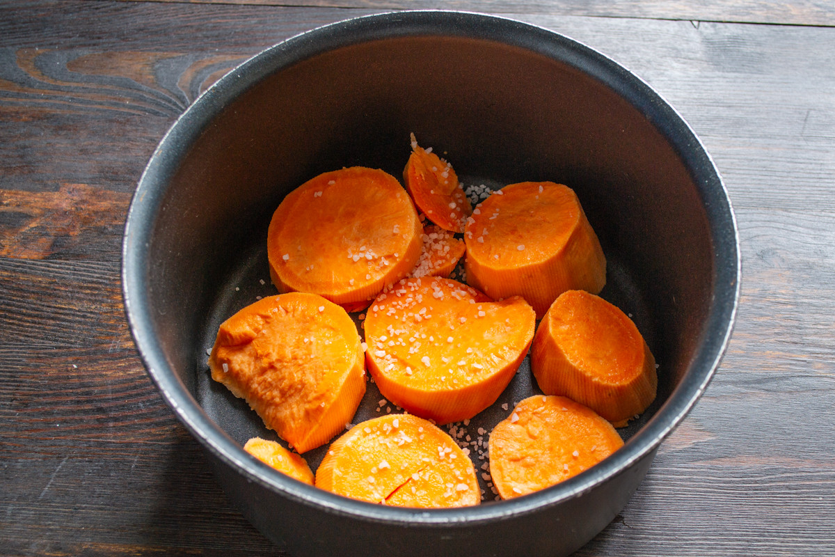 Сладкий картофель (батат) чистим от кожуры, нарезаем клубень ломтиками толщиной чуть больше одного сантиметра. Кладем нарезанный батат в кастрюлю, солим, заливаем кипящей водой.
