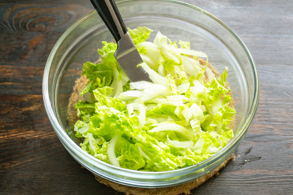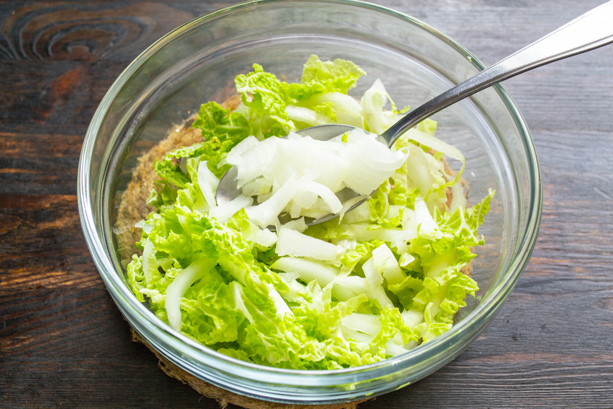 Репчатый лук режем тонко. Нарезанный лук добавляем к пекинской капусте.