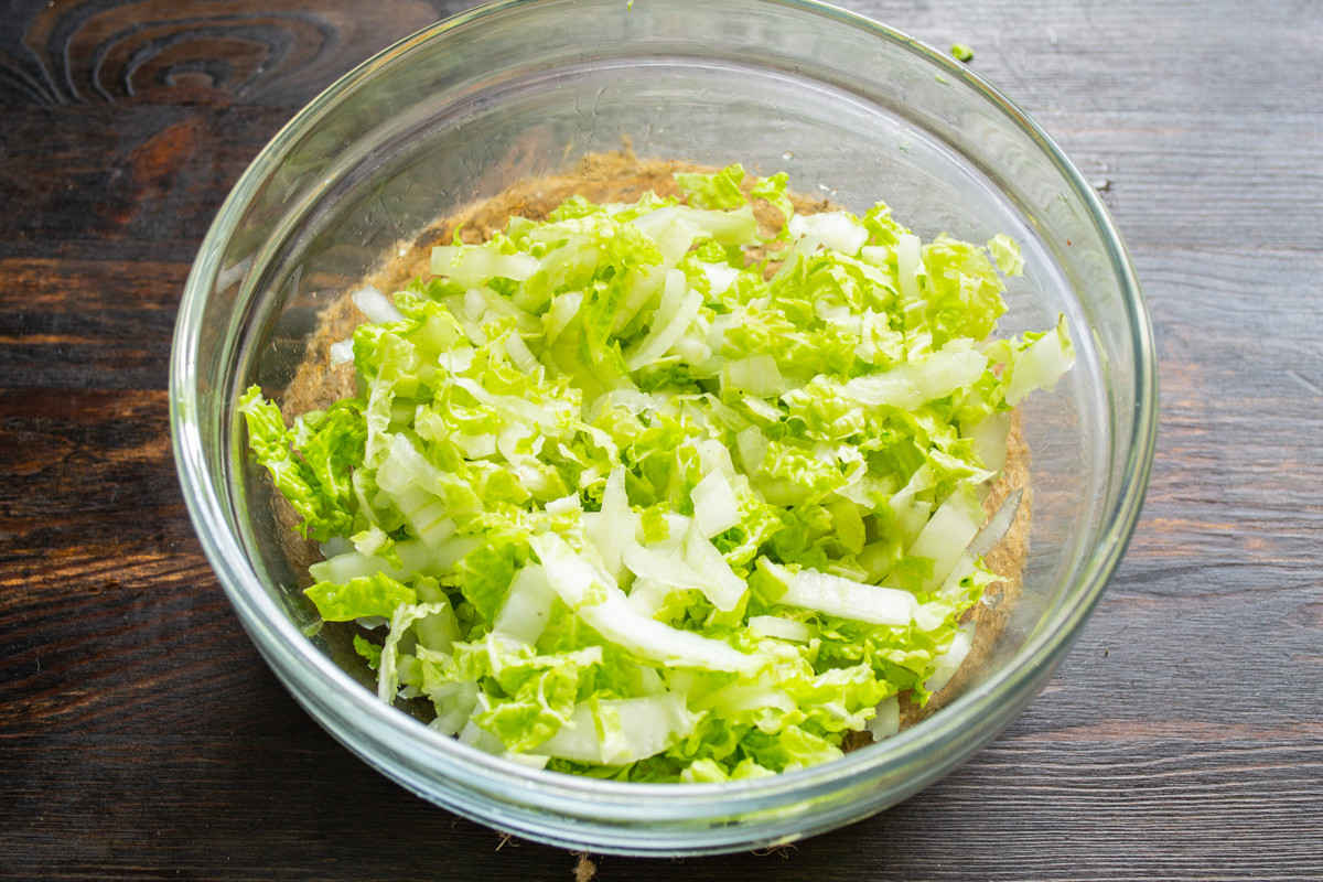 Пекинскую капусту шинкуем узкими полосками. Можно готовить салат с любыми хрустящими зелеными листьями. Подойдет салат айсберг, ромен, в общем, все что зелено и хрустит.