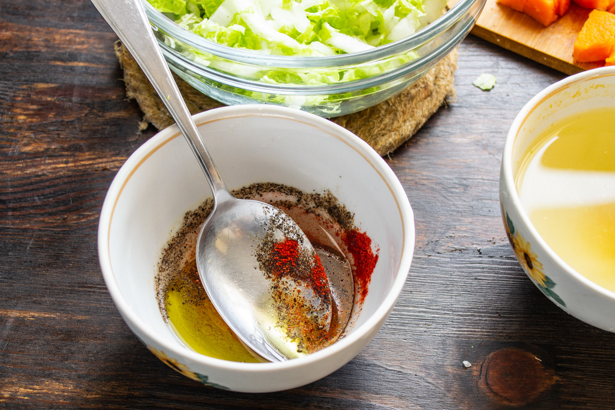 Наливаем в мисочку 2-3 столовые ложки отвара, в котором варился сладкий картофель. Добавляем оливковое масло холодного отжима, яблочный уксус. Насыпаем паприку и молотый черный перец. Хорошо смешиваем заправку. По желанию в неё можно добавить чайную ложку дижонской горчицы. Заправку удобно смешивать в банке с герметично прилегающей крышкой. Я готовлю заправку с домашним уксусом. Не советую уксус из магазина, лучше замените его свежевыжатым лимонным соком.