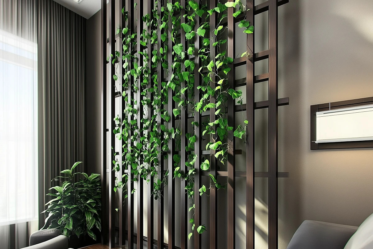 Когда масштабы замысла растут вместе с самим растением, и возникает желание оформить большую часть стены, на помощь приходят опорные конструкции. Блестящим примером служит напольная или распорная решетка-шпалера. Это может быть изящная конструкция из бамбука, тонких деревянных реек или металла, которая устанавливается прямо в кашпо с растением или становится самостоятельным элементом интерьера, упираясь в пол (например стилизованная лесенка).
