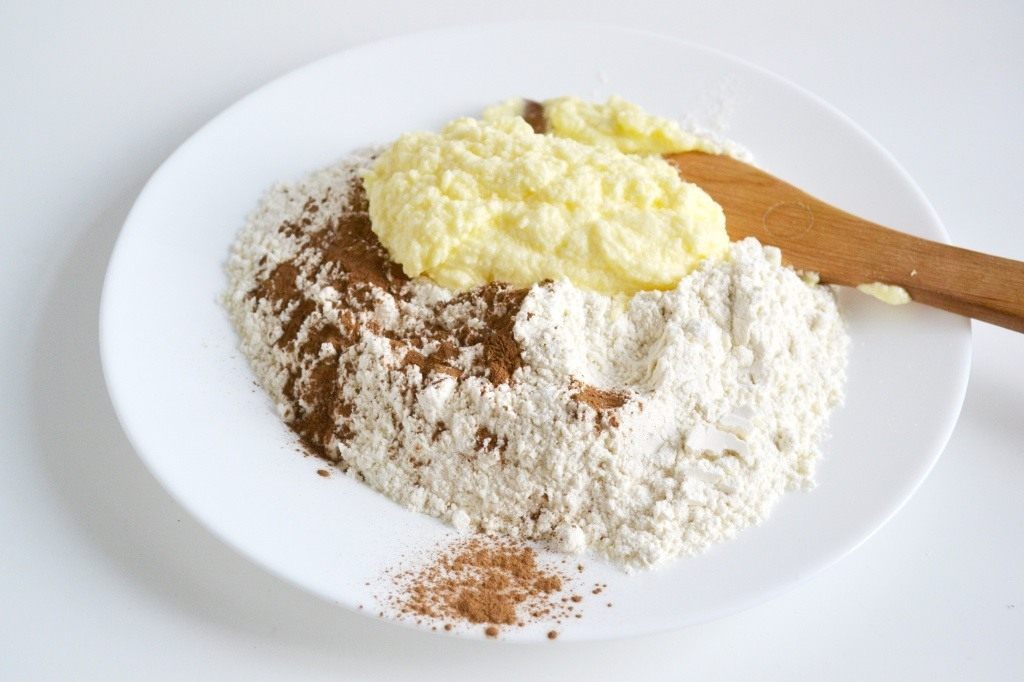 В кухонном комбайне смешиваем сахар, масло, желток и воду. Добавляем смесь в просеянную муку, смешанную с корицей. Замешиваем тесто.