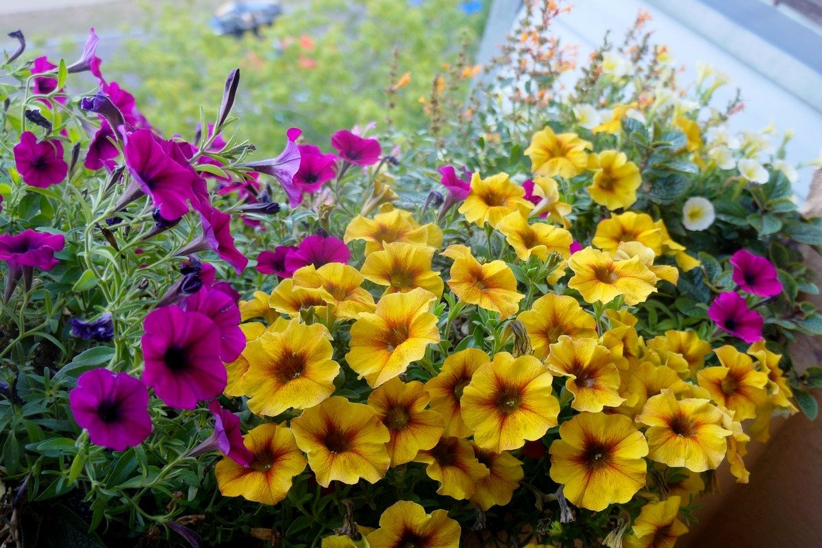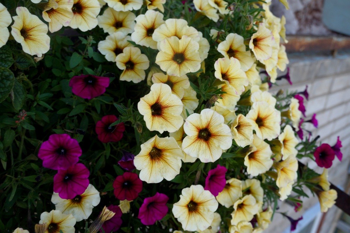 На своем балконе я выращивала три сорта петхоа: BeautiCal French Vanilla (желтый), BeautiCal Caramel Yellow (оранжевый) и BeautiCal Cinnamon (красно-коричневый). Растения я приобрела небольшими черенками, и за лето они нарастили приличную зеленую массу. Цветение было очень обильным, и у петхоа я не заметила никаких перерывов в цветении (в отличие от многих петуний, цветущих волнообразно). У меня также ни разу не возникло желание их подстричь, ведь никакого «облысения» или вытягивания кустиков не наблюдалось.