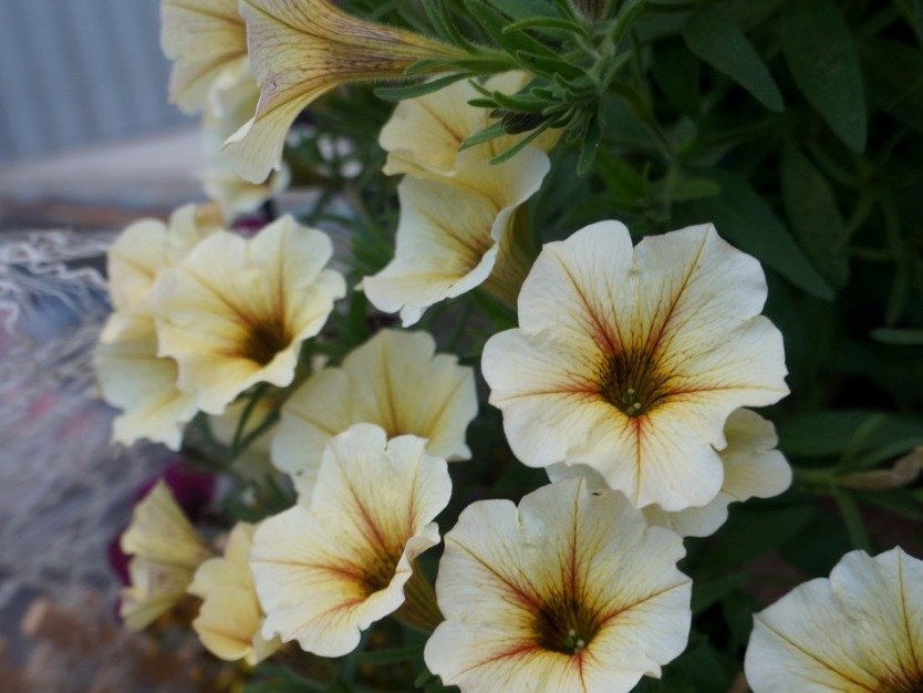 Петхоа ‘BeautiCal French Vanilla’ («Французская Ваниль»). Цветки этого сорта имеют желтый цвет, но назвать их просто желтыми было бы слишком просто. Желтый цвет здесь представлен очень редким благородным оттенком, напоминающим цвет слоновой кости. На светлых лепестках присутствует множество прожилок желтого цвета, которые по мере удаления от края превращаются в коричневые. В центре цветка прожилки сливаются, образуя выразительный, практически черный глазок. Форма куста ампельная, побеги опускаются на 60 сантиметров.