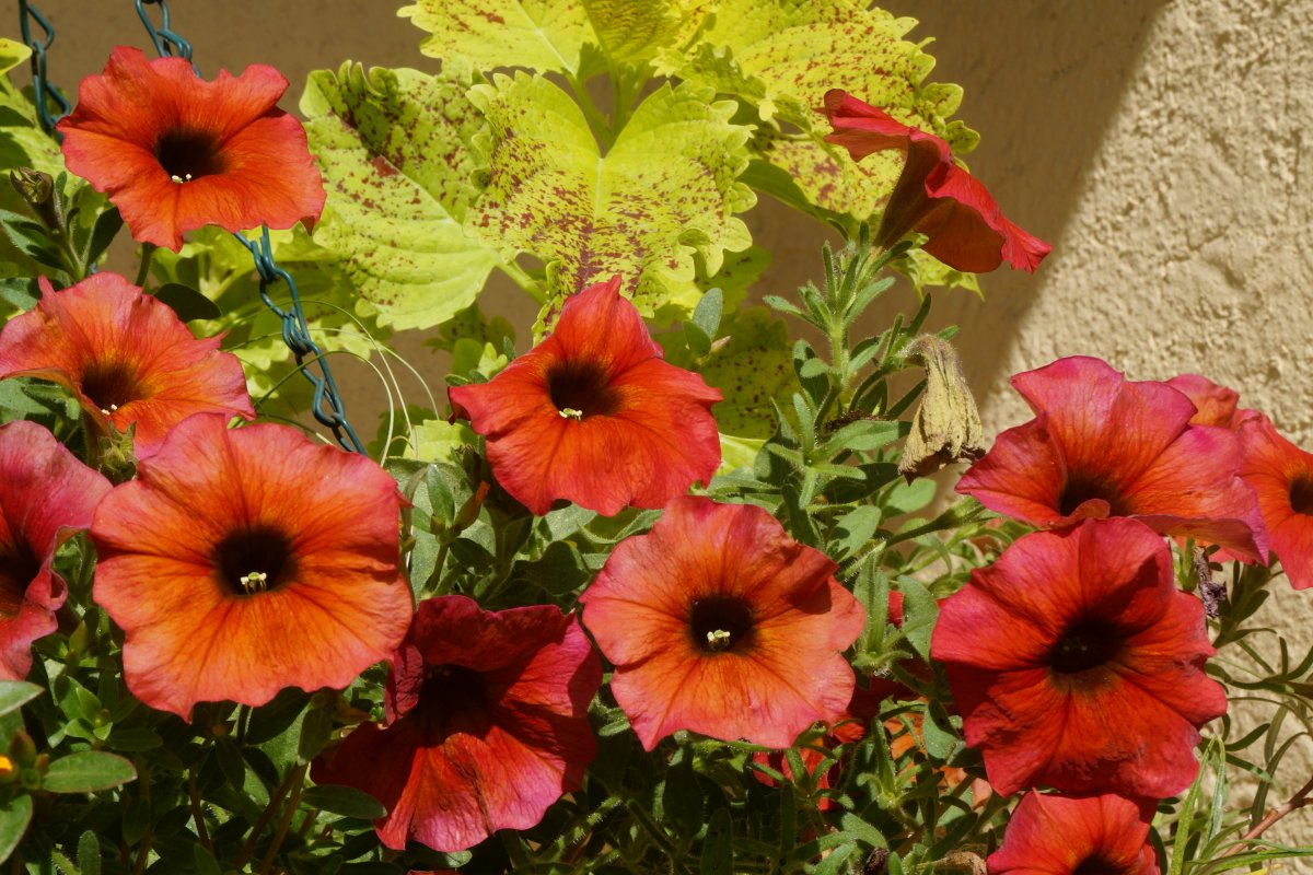 Петхоа ‘BeautiCal Cinnamon’ («Корица»). Благодаря присутствию генов калибрахоа, цветки сорта имеют очень сложную окраску с теплыми оранжевыми оттенками. Окраску лепестков этого сорта можно описать как бронзовые, терракотовые, красно-коричневые, темно-оранжевые тона. Но ни один из этих колеров не будет точным описанием их истинной расцветки. Лепестки этой петхоа окрашены во множество оттенков, а в самой глубине цветка становятся практически черными. Форма куста — полуампельная.