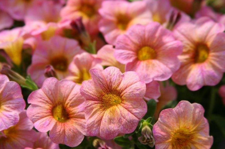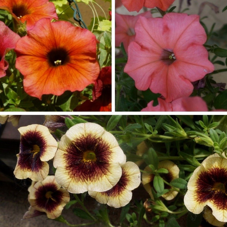 Петхоа ‘SuperCal Terra Cotta’ («Терракота»). Окраска нежных лепестков этого культивара напоминает теплый летний закат. Краешки лепестков имеют розоватый румянец, ближе к центу лепестки становятся желтыми, а сердцевина окрашена в темно-коричневый. Дополнительную оригинальность добавляет темное жилкование. Благодаря родству с калибрахоа, такой необычный оттенок у этого сорта петхоа стабилен, не выгорает и не меняется по мере роспуска цветка. Форма куста ампельная, побеги могут спускаться вниз на 30-60 сантиметров.
