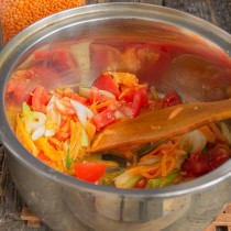 Спелые красные помидоры режем кубиками, добавляем к пассерованным овощам, готовим на небольшом огне 5 минут. Свежие помидоры можно заменить домашним томатным пюре с болгарским перцем.