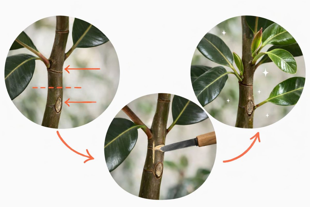 У фикусов гормоны-ингибиторы (ауксины) спускаются от верхушки вниз по тканям коры, подавляя боковые почки. Делая глубокий надрез над почкой, мы перерезаем «магистраль», по которой идут эти запрещающие сигналы. Почка под надрезом получает шанс на развитие.