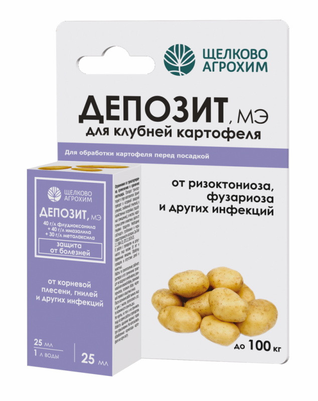 Для защиты картофеля в личных подсобных хозяйствах компания «Щёлково Агрохим» предлагает специализированный фунгицидный протравитель «Депозит, МЭ». Это очень эффективный стимулирующий и защитный препарат для предпосадочной обработки клубней.