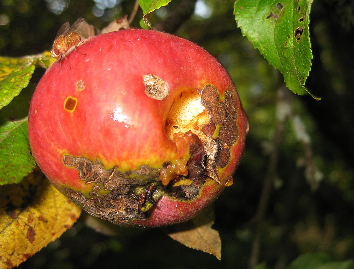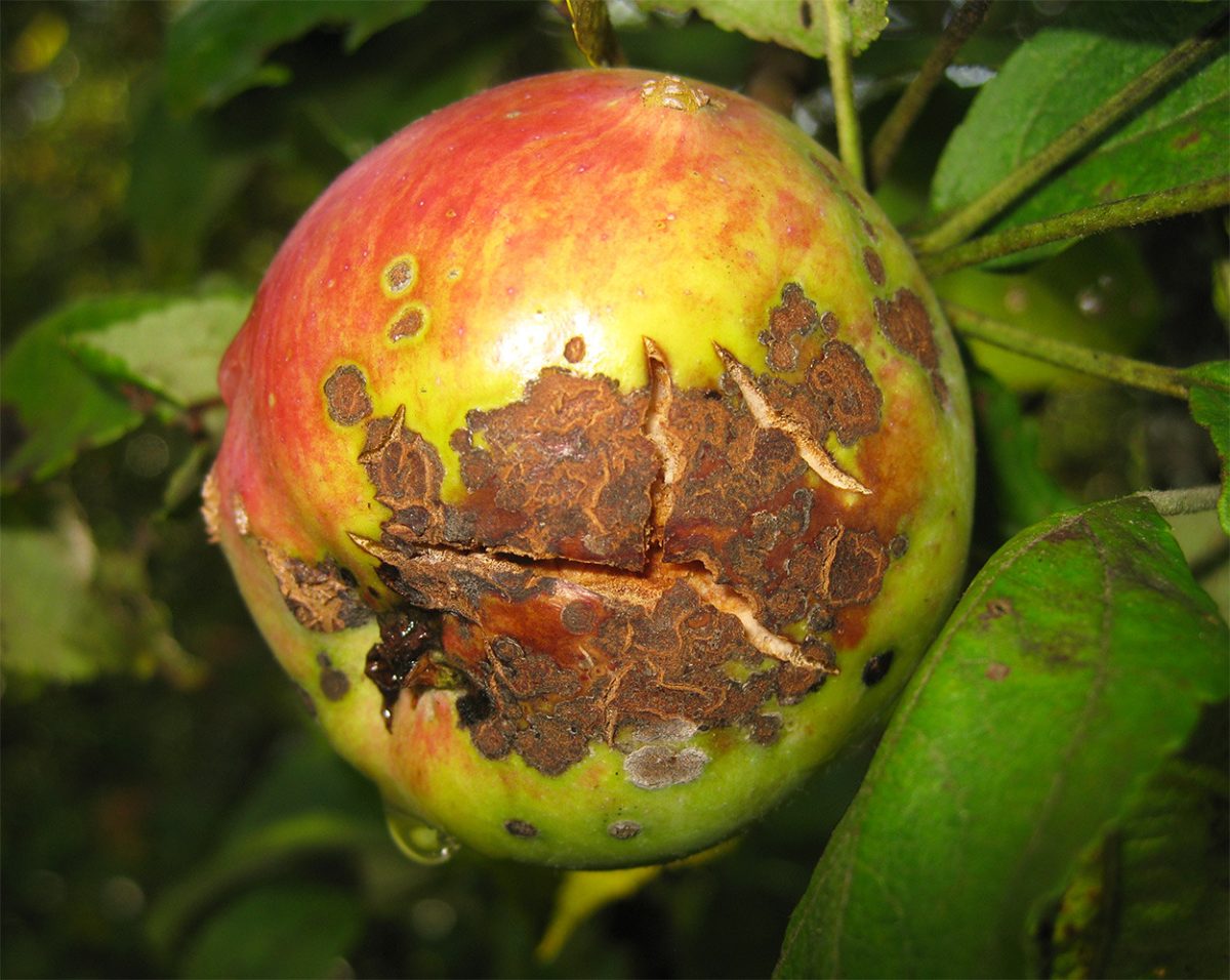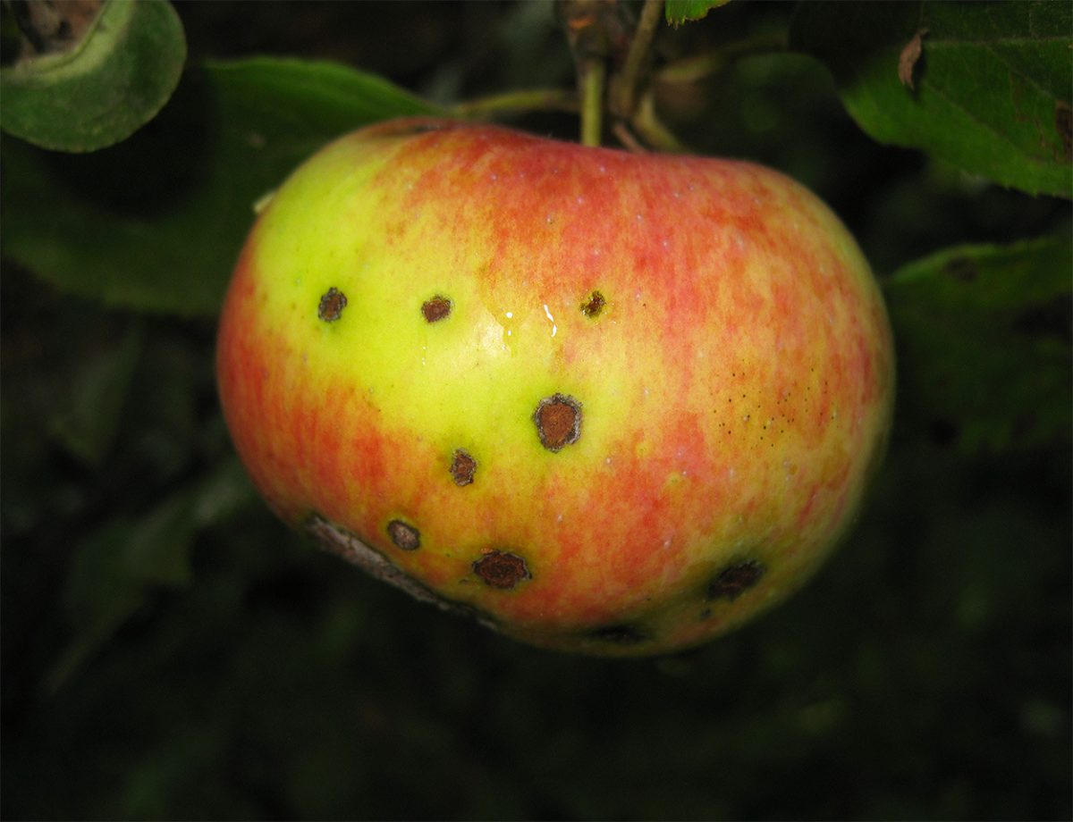 На ранней стадии она проявляется в виде чёрных точек на плодах, а если не принять меры, то превращается в большие затвердевшие или подгнивающие участки. Потом яблоки либо остаются висеть и гнить, либо осыпаются раньше, чем созреют.