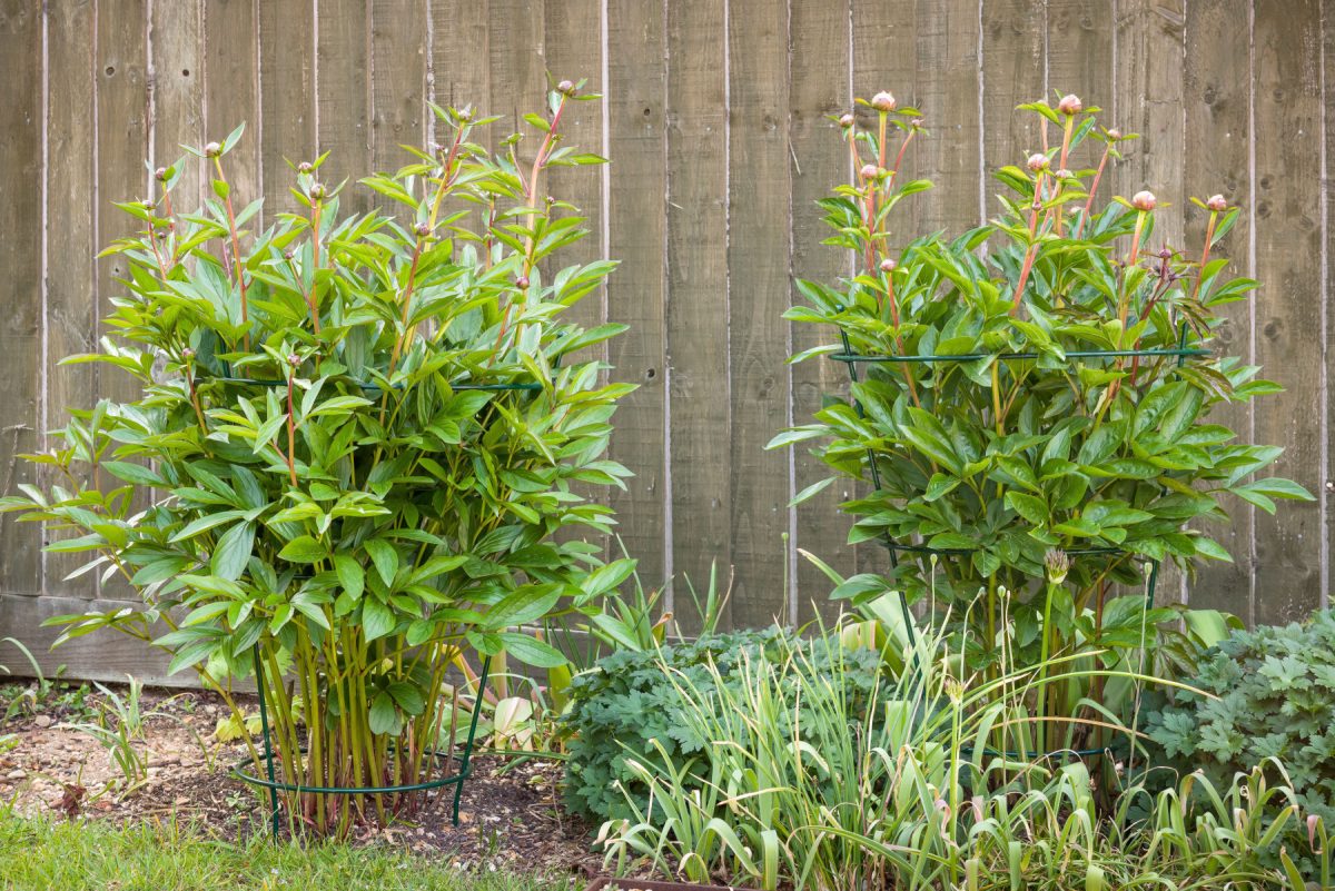 Пионы и другие кустистые многолетние культуры благоприятно отзываются на поддержку при помощи кустодержателя. Каркас устанавливается сразу после появления первых ростков. Стебли, прорастая сквозь опору, будут удерживаться в вертикальном положении.