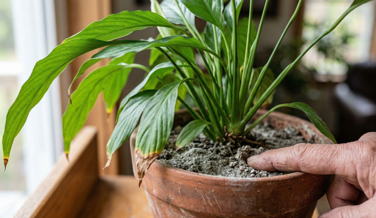 Дополнительный признак – светлый налёт на поверхности почвы или по внутреннему краю горшка. Это как раз тот случай, когда проблема идёт не от одного полива, а от многомесячной привычки. Кончики при этом сохнут спокойно, без резких скачков, но всё время понемногу ползут дальше.