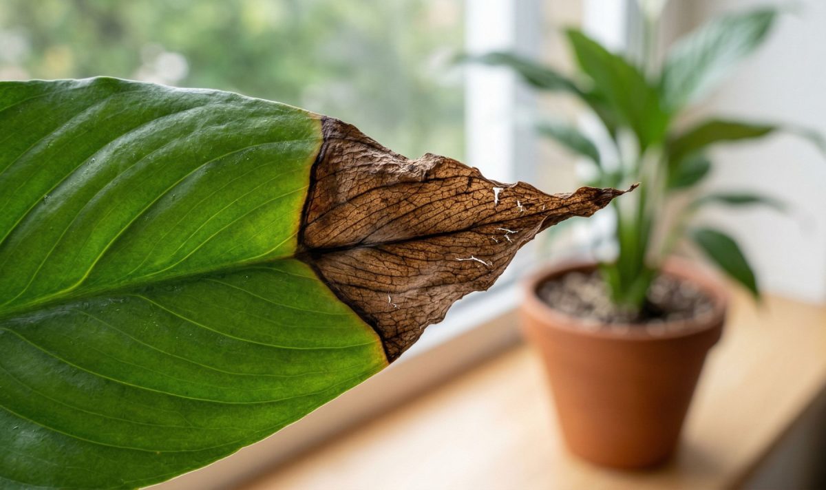 У спатифиллума кончики подсыхают обычно по одной причине: когда листья испаряют влагу быстрее, чем корни успевают её подать, край листовой пластины страдает первым. Чаще всего дело не в болезни и не во вредителях. Это сбой водного баланса.