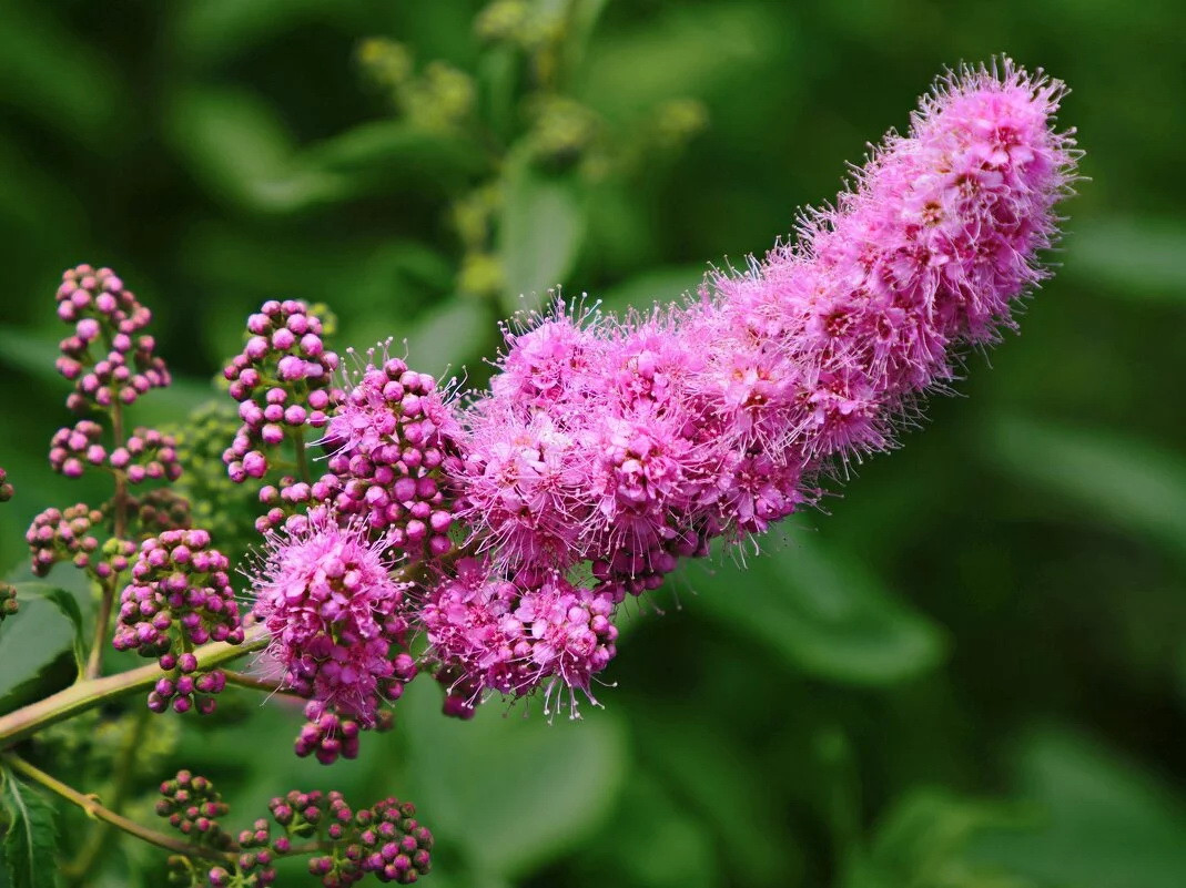 Цветочки у спирей мелкие, обильные, собраны в самые разнообразные соцветия, слегка ароматные и медоносные. Одни виды цветут весной, другие — летом. Весеннецветущие кустарники с белыми цветками, у летнецветущих палитра пошире — от белого до пурпурного. Сроки цветения определяют и особенности формирования кустарников: цветочные почки у весеннецветущих закладываются на побегах прошлого года, у летнецветущих — на молодых побегах. То есть обрезать спиреи, цветущие весной, нужно сразу после цветения, а летнецветущие можно кардинально резать как осенью, так и в самом начале весны.
