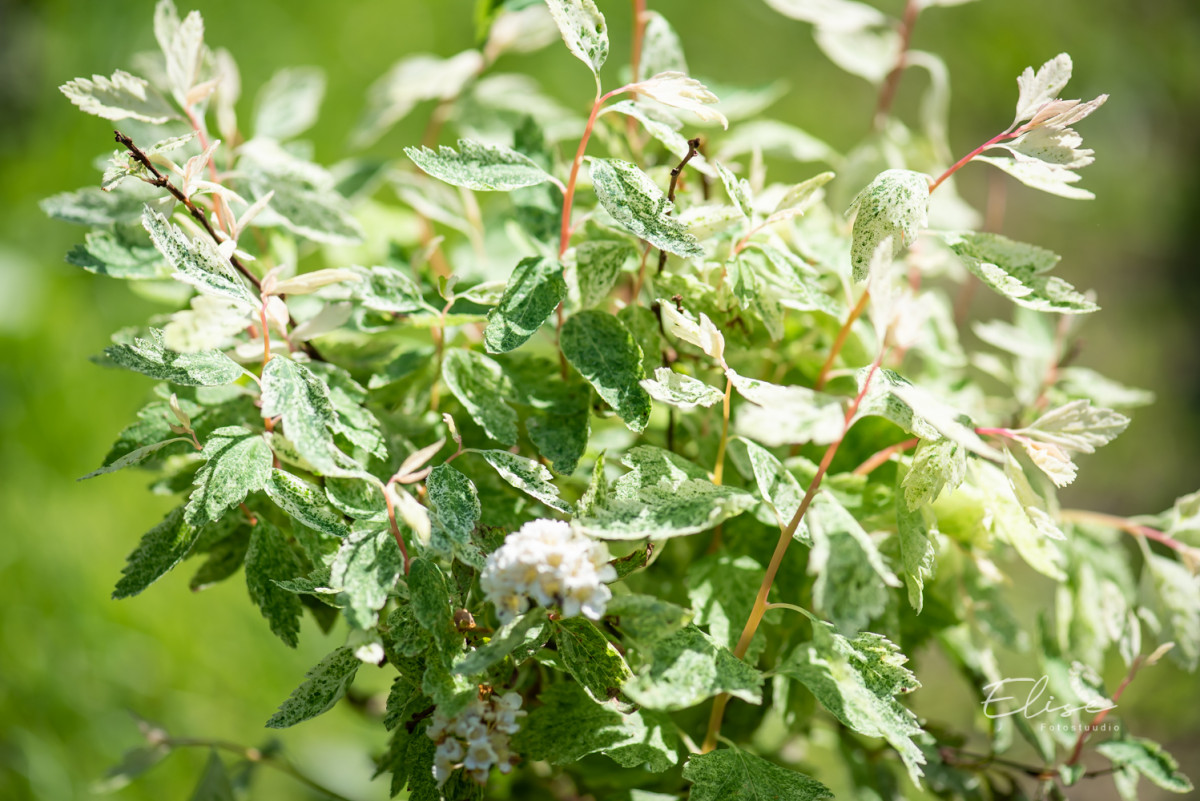 Знаменитая «Широбана» (Spiraea japonica ‘Shirobana’) — сорт-химера. Весной листва на побегах имеет разные оттенки от тёмного до светлого. И цветки на этих побегах распустятся разные: тёмно-розовые, светло-розовые и белые. Бывает, и в одном соцветии цветки разные.