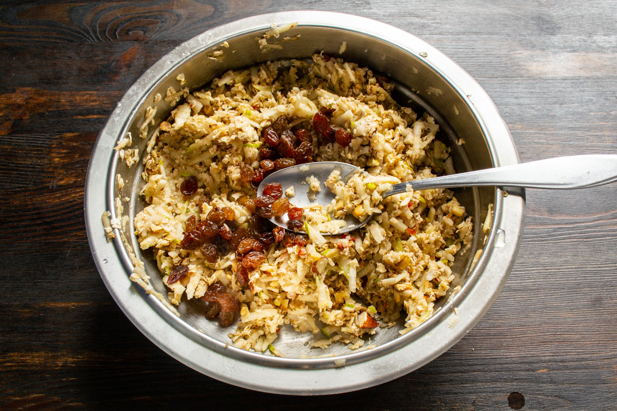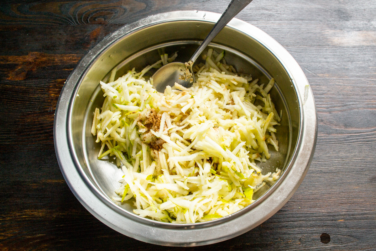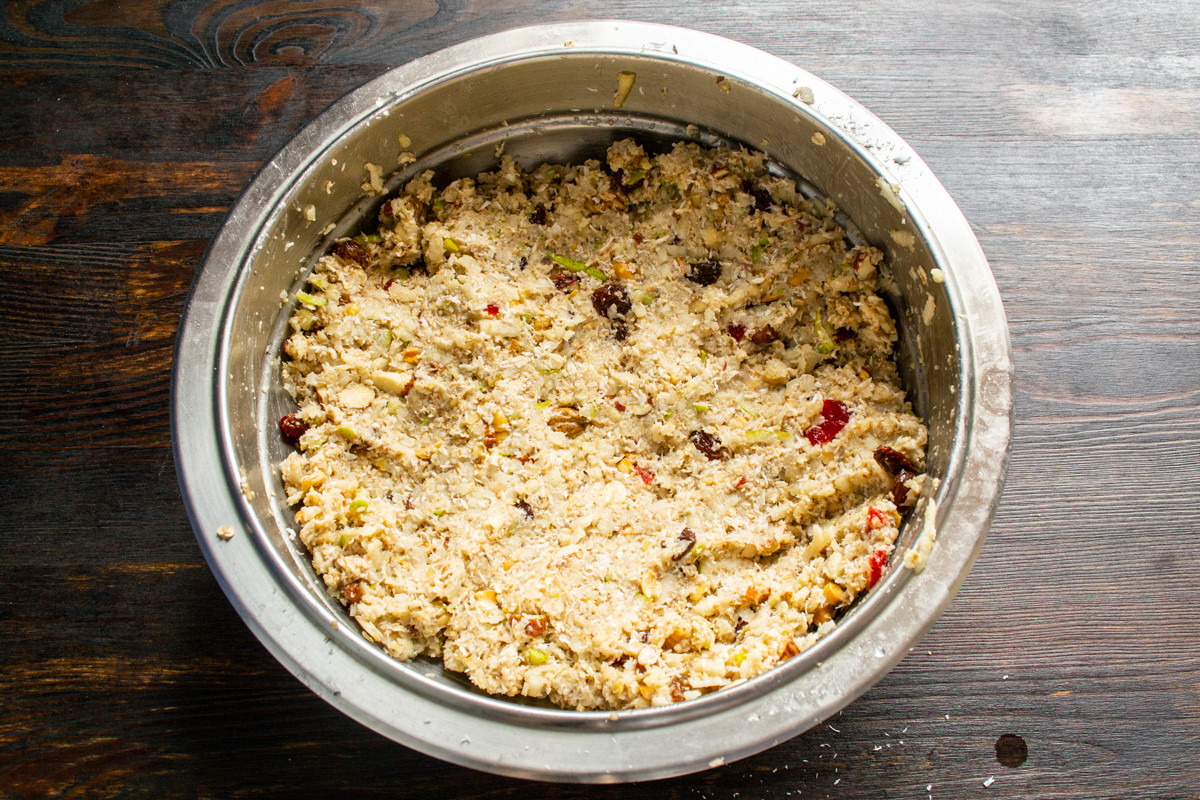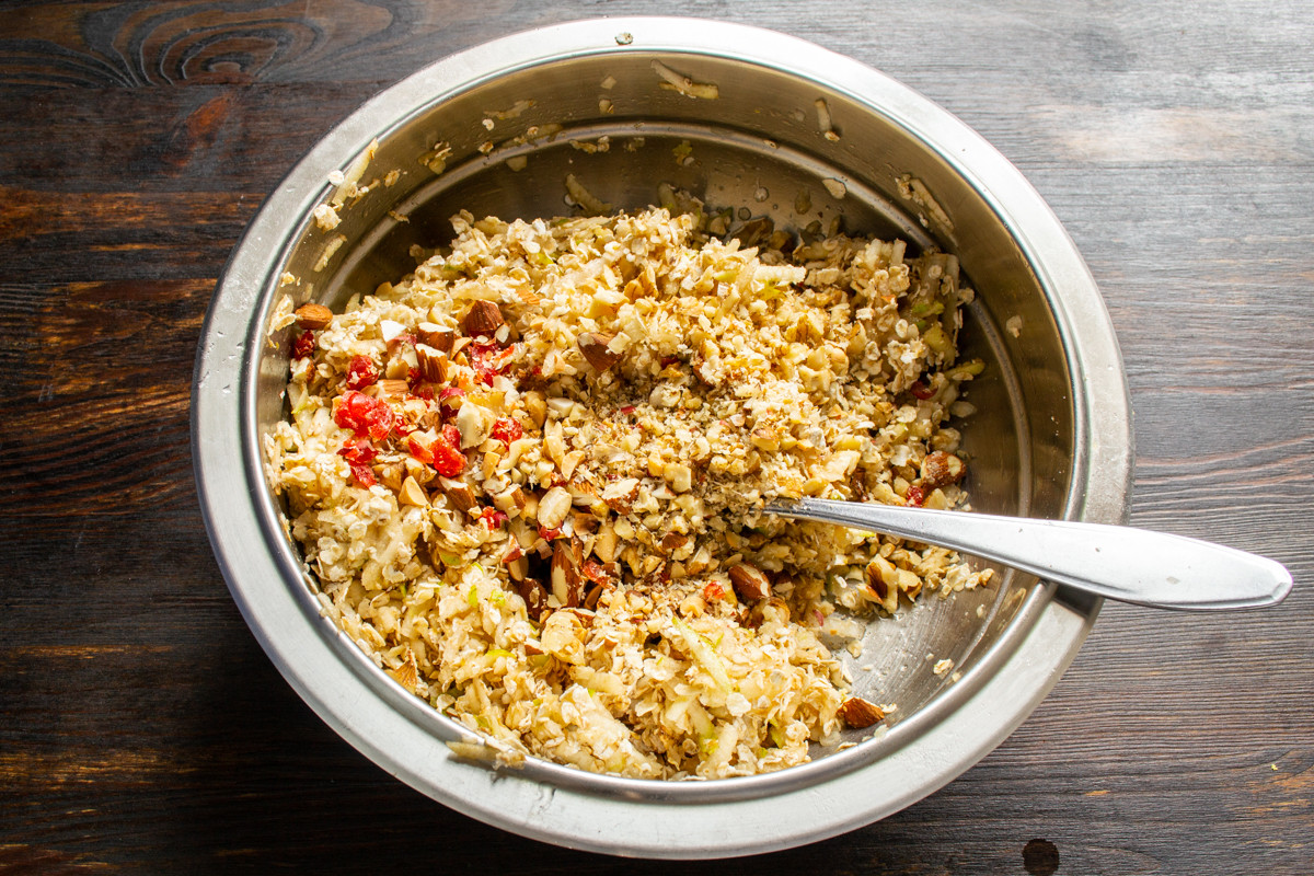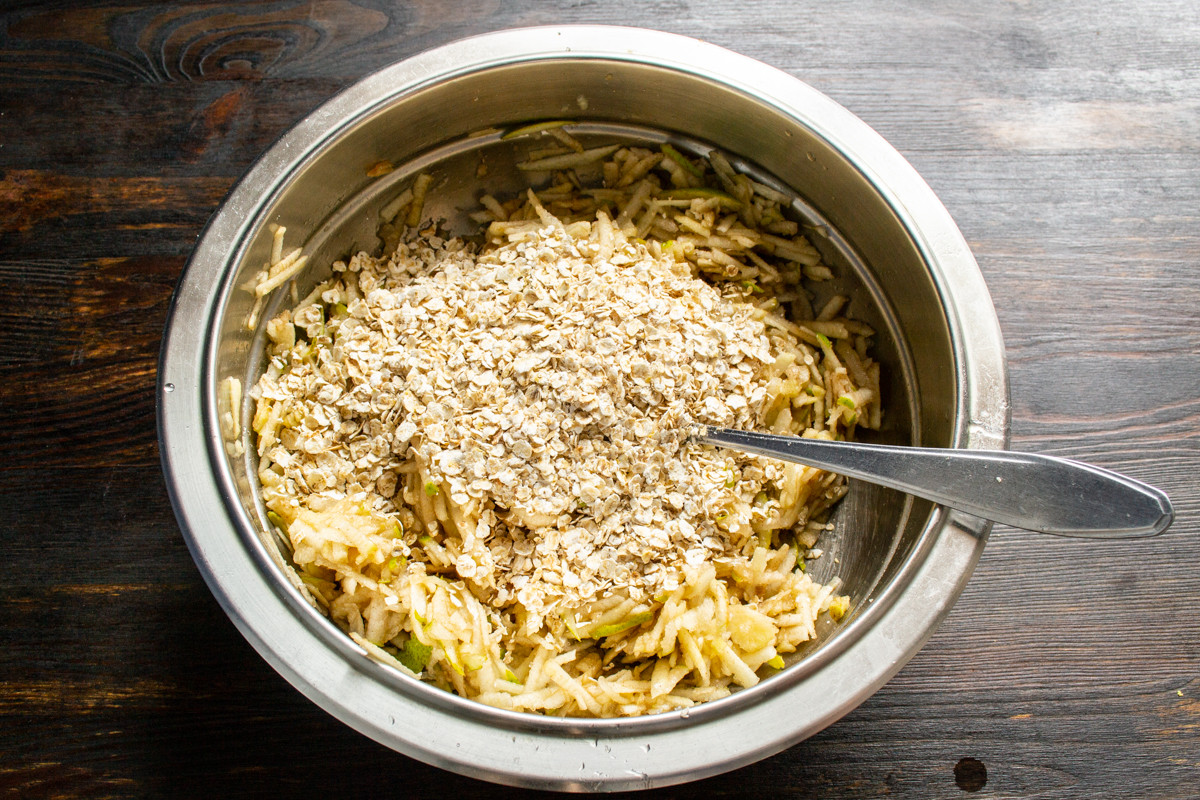 Хорошо перемешиваем тесто. Оставляем при комнатной температуре на полчаса, чтобы овсяные хлопья впитали влагу из фруктов и набухли.