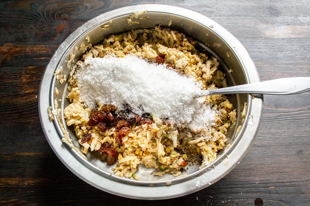 Насыпаем примерно половину стакана мелкой кокосовой стружки. Вы можете использовать свежий кокос с этом рецепте, батончики получатся более влажными.