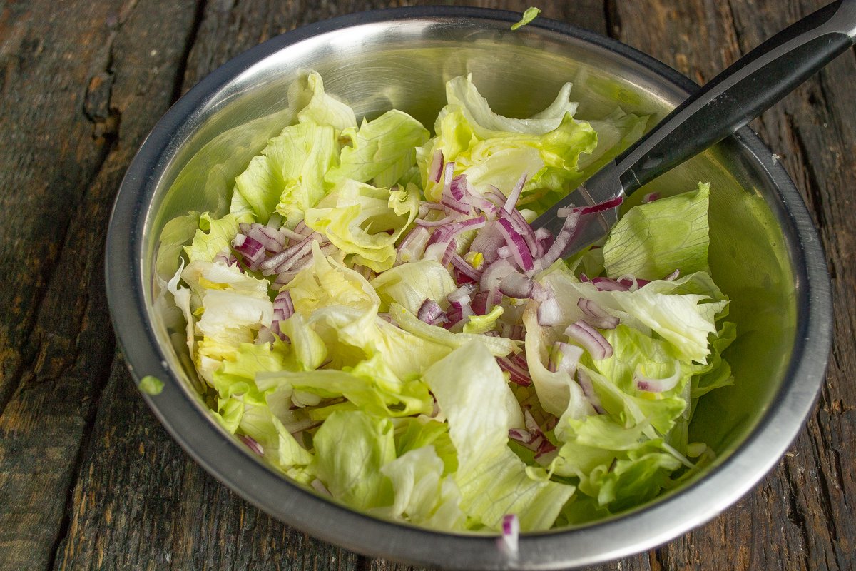 Красную луковицу нарезаем тонкими полукольцами, добавляем в салатник к нарезанному айсбергу.