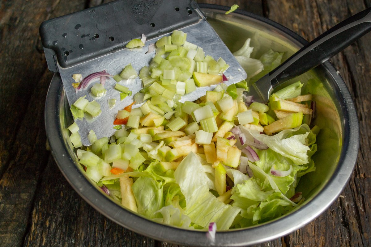 Стебли сельдерея очищаем от грубых волокон. Нарезаем сельдерей мелко, добавляем к остальным ингредиентам.
