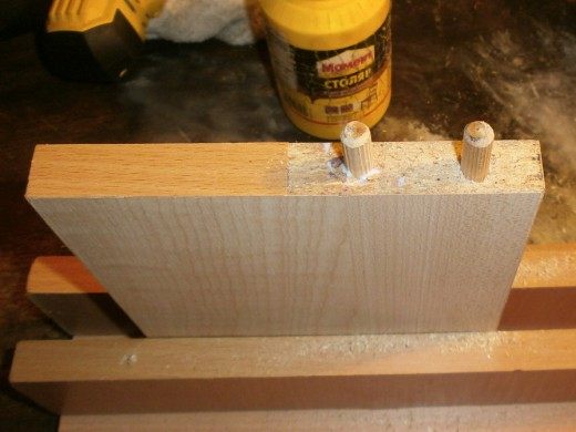 Клей подсох. Теперь также соединяем обе половинки на шкантах и клею, снова прижимаем струбциной и на несколько часов оставляем сохнуть.