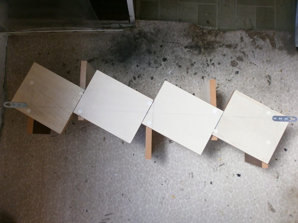 Теперь размечаем основу будущей полочки для цветов, сверлим отверстия, и прикручиваем сами ячейки, чередуя их вправо и влево.