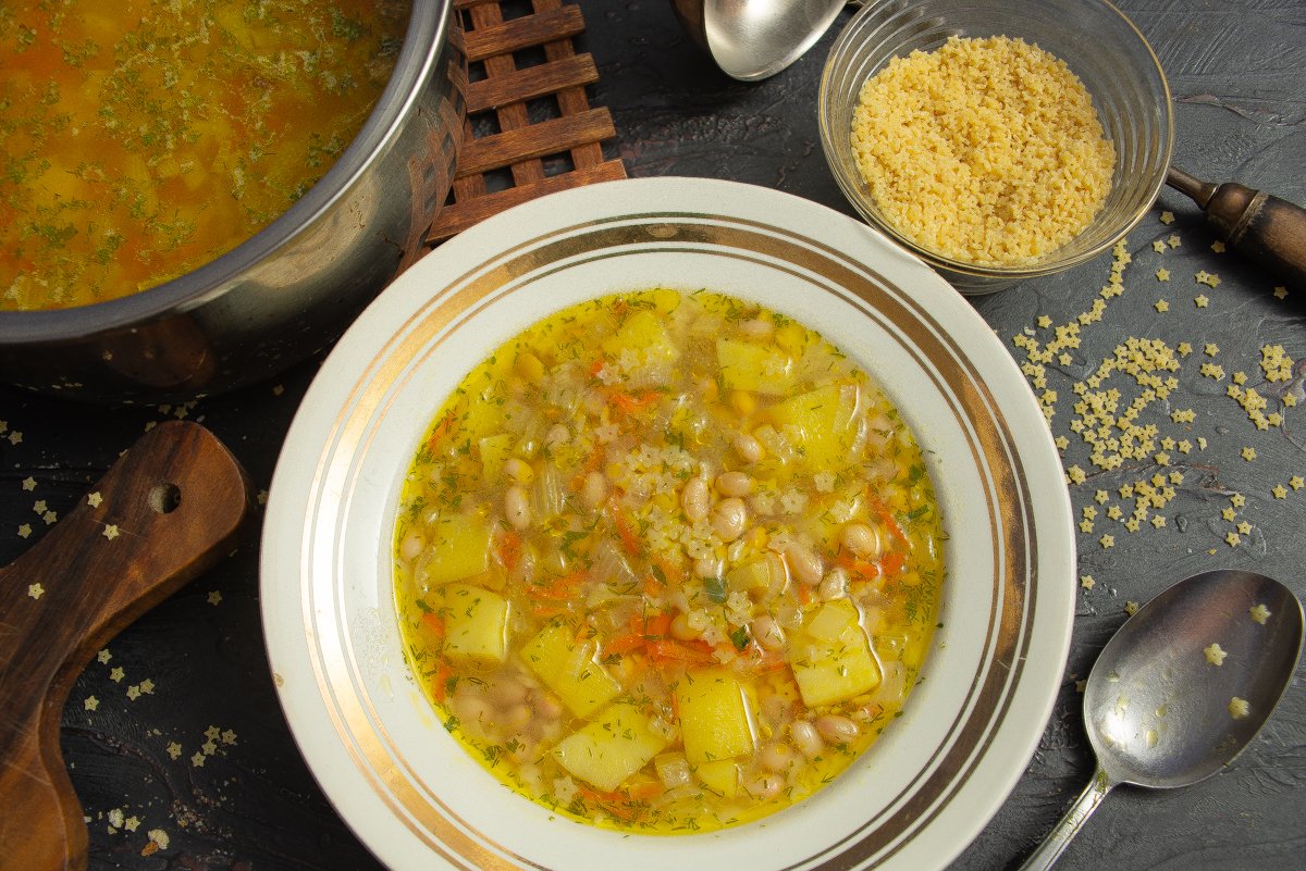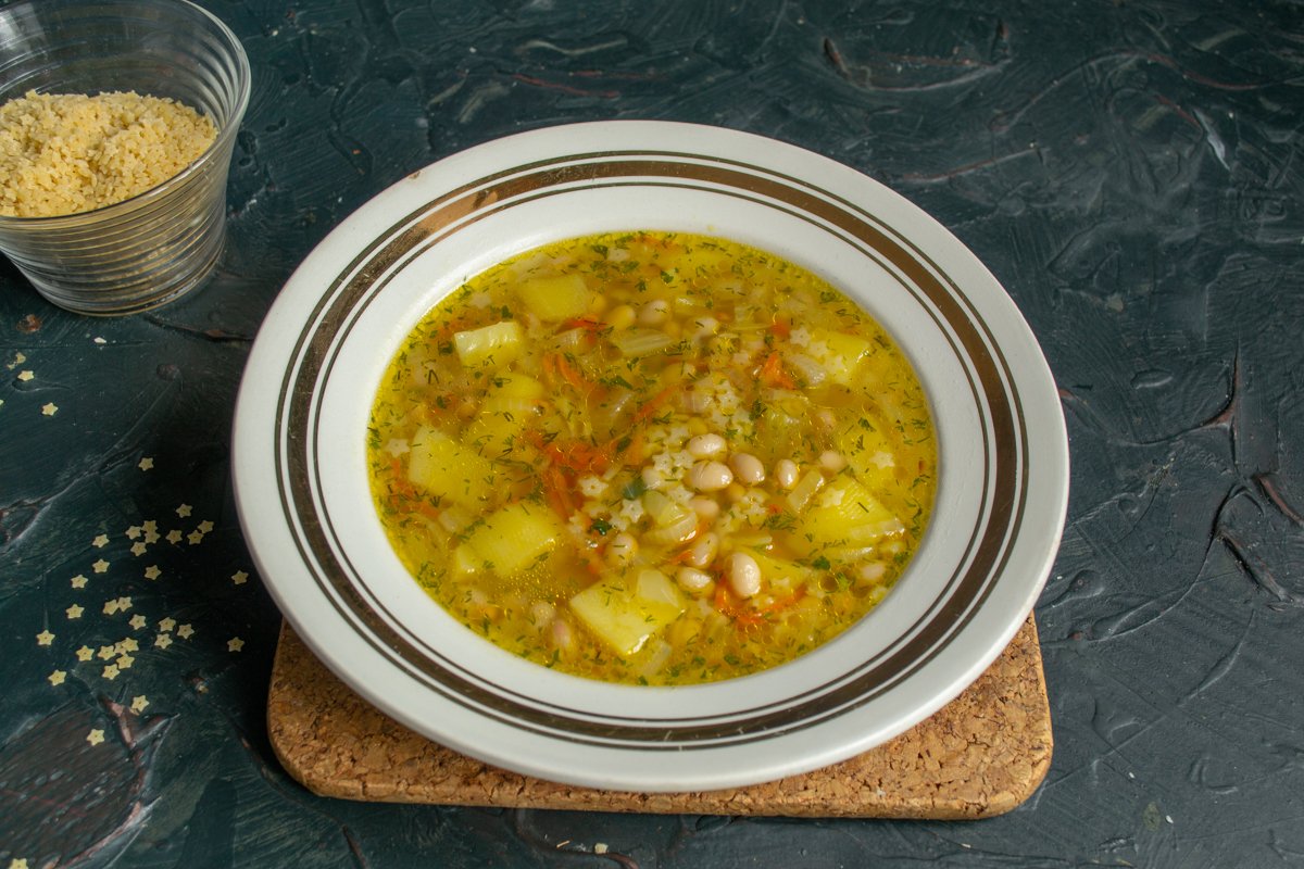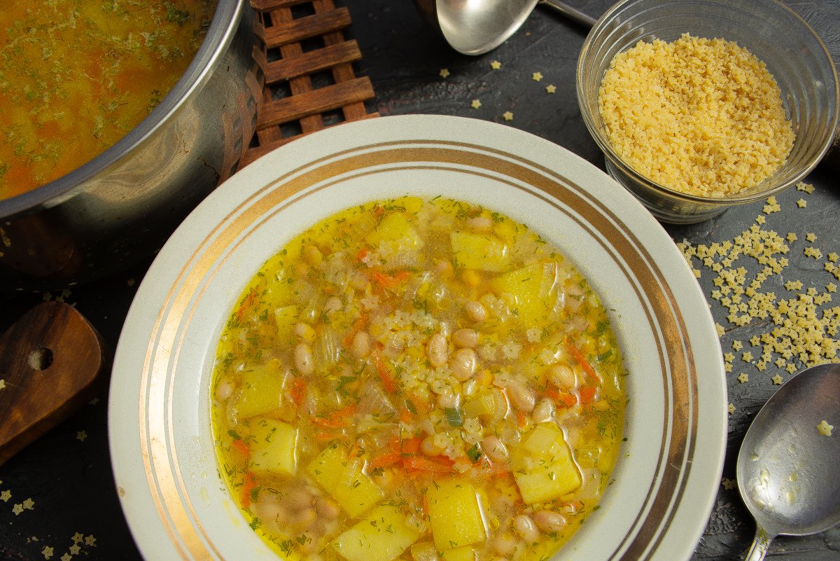 Суп со звёздочками и фасолью на овощном бульоне — постный фасолевый суп из простых и доступных продуктов. На его приготовление нужно чуть больше получаса. Фасолевый суп, сваренный по этому рецепту, не содержит продуктов животного происхождения и подходит для вегетарианского и постного меню. Я готовила из консервированной белой фасоли, если есть время, то отварите сухую фасоль. Паста «Звёздочки» — идеальный выбор для первого блюда, малюсенькие макароны готовятся очень быстро.