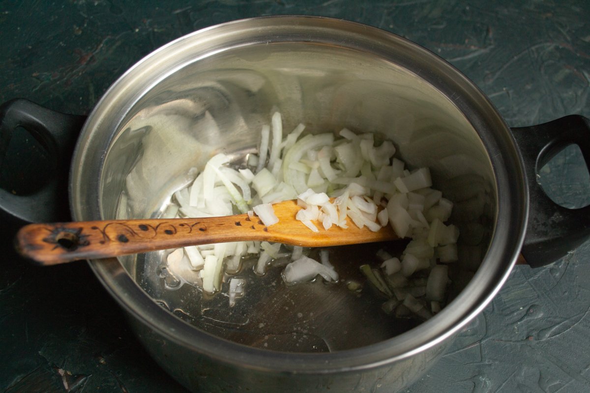 Для приготовления фасолевого супа небольшую головку репчатого лука режем мелко. В кастрюлю наливаем растительное масло без запаха, кладём нарезанный лук.