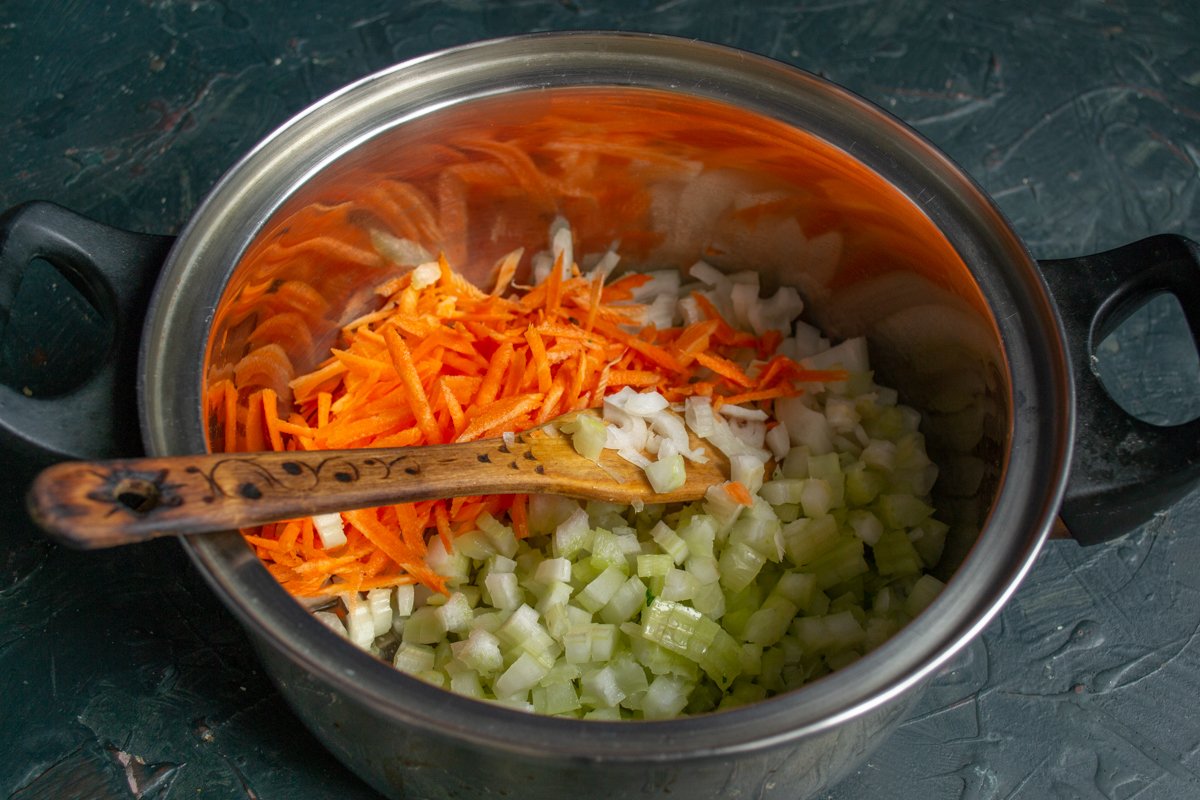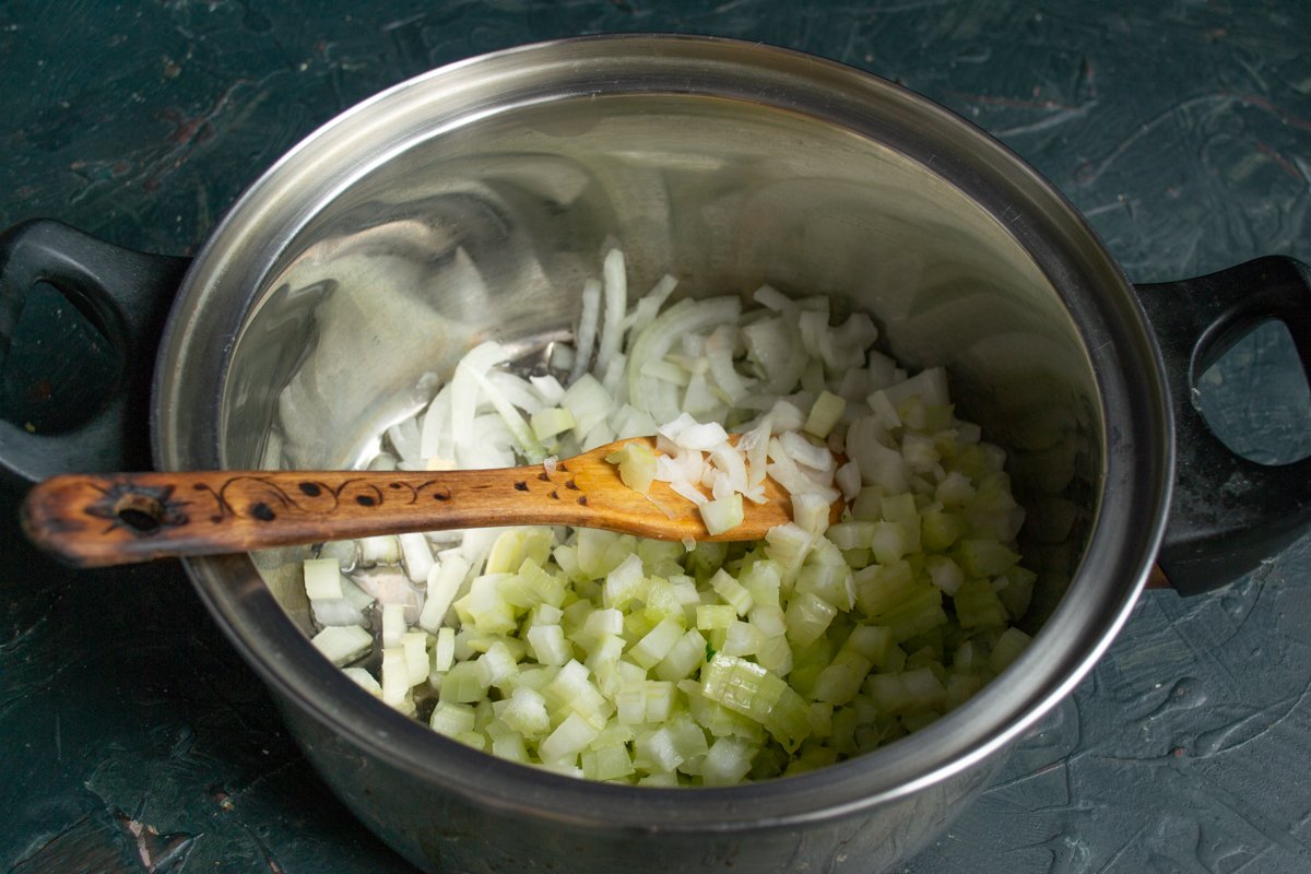 Со стеблей сельдерея удаляем жесткие волокна, нарезаем сельдерей мелко, добавляем в кастрюлю к луку.