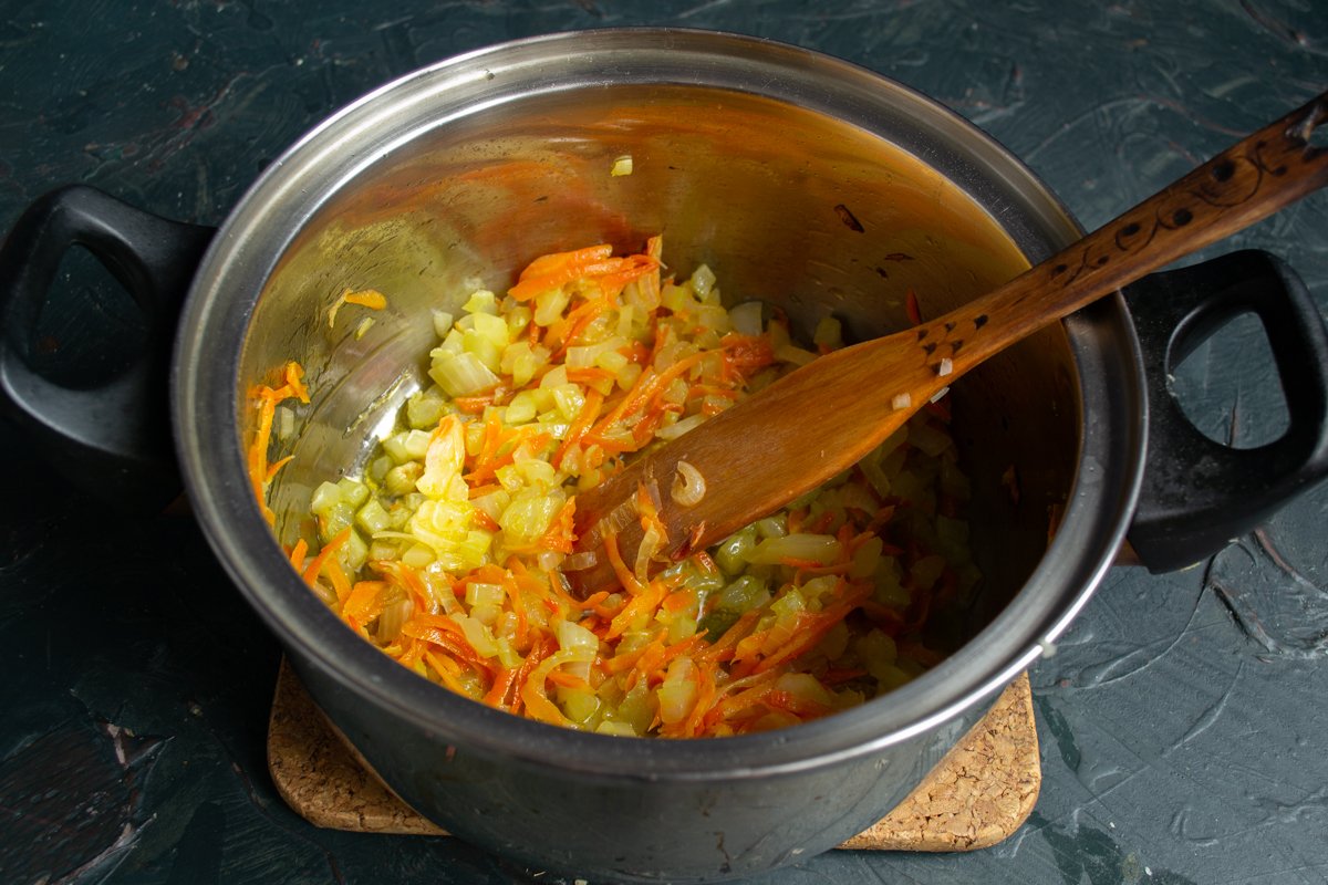 Посыпаем овощи щепоткой соли – соль вытянет воду из овощей, и в процессе приготовления они не пригорят. Обжариваем овощи на умеренном огне 10 минут. В разных странах обжарку овощей (обычно морковь, лук и сельдерей) готовят по-своему и называют по-разному: в Италии – софрито, во Франции – мирпуа. Способ приготовления похож, есть незначительные отличия в ингредиентах, но в любом случае это лучшая ароматическая основа для супа и рагу!
