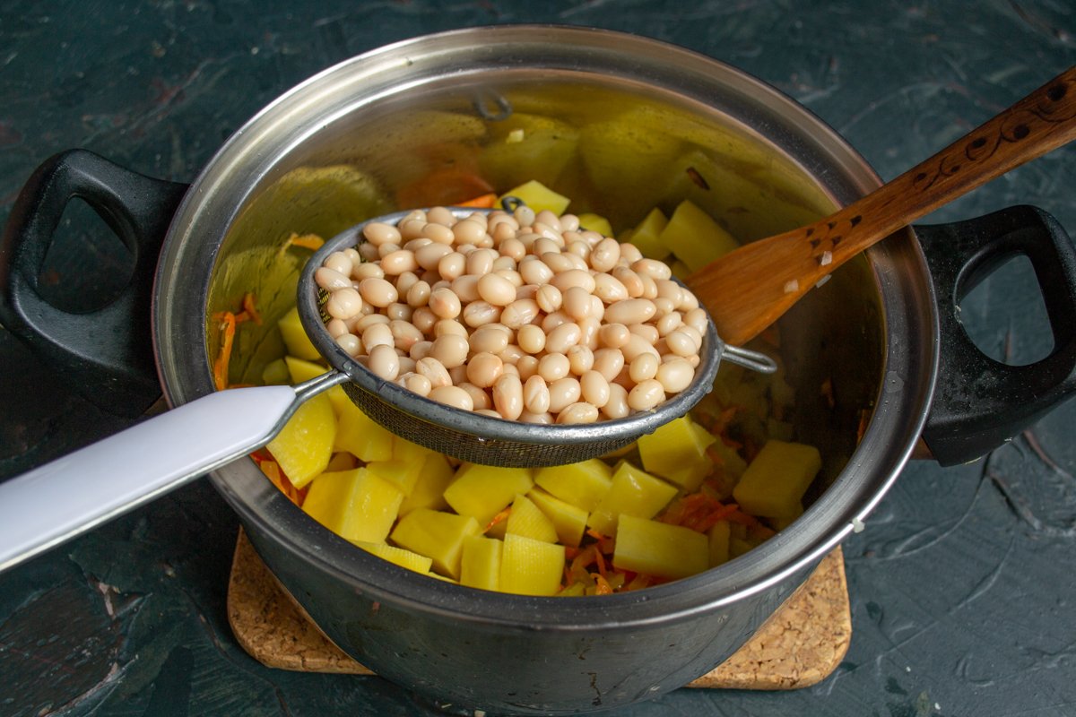 Белую консервированную фасоль откидываем на сито, промываем проточной водой и добавляем к остальным ингредиентам. Этот суп будет ещё более вкусным, если отварить сухую фасоль, и добавить фасолевый отвар к овощному бульону. Правда, придётся истратить больше времени на готовку: сухую фасоль нужно замочить на несколько часов и варить около часа.