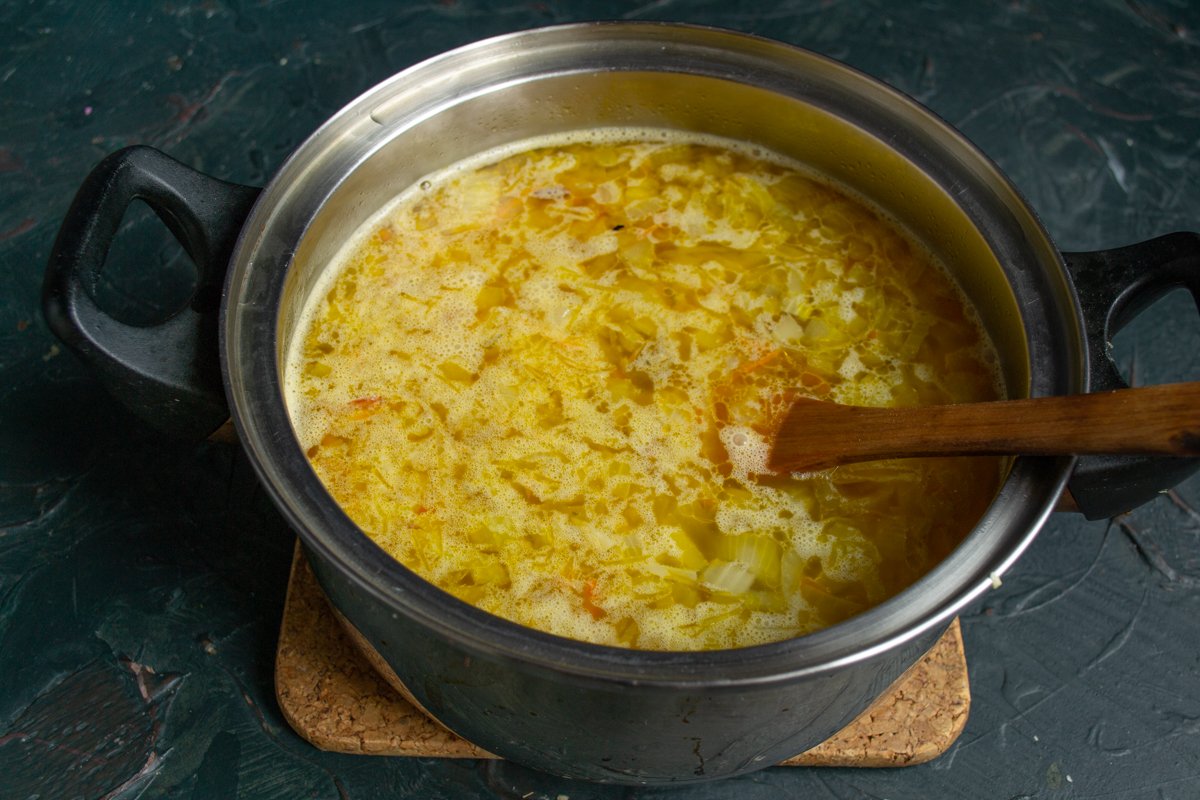 Наливаем в кастрюлю с овощами горячий овощной бульон. Нагреваем суп до кипения, уменьшаем нагрев и варим на тихом огне примерно полчаса. Овощной бульон можно использовать готовый или сварить самостоятельно из простого набора овощей: лук, морковь, сельдерей, зелень и специи залить водой, варить час и процедить.