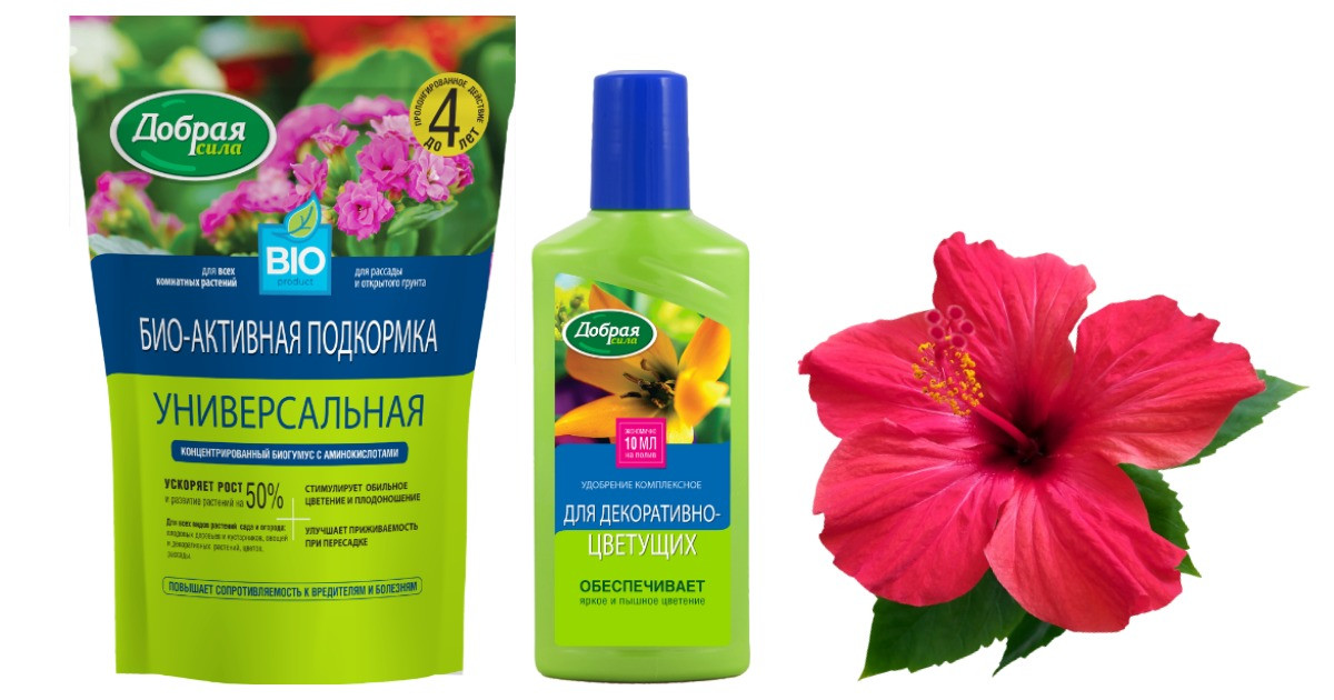 Естественно, никакой весенний уход за комнатными растениями не обходится без внесения удобрений. И чем больше вы удалили или укоротили побегов, тем «вкуснее» нужно подкормить гибискус после обрезки. Для активации роста корней и стимуляции вегетации можно для начала внести био-активную подкормку Универсальная Добрая сила – 5-10 г на куст (в зависимости от размера горшка и возраста растения).